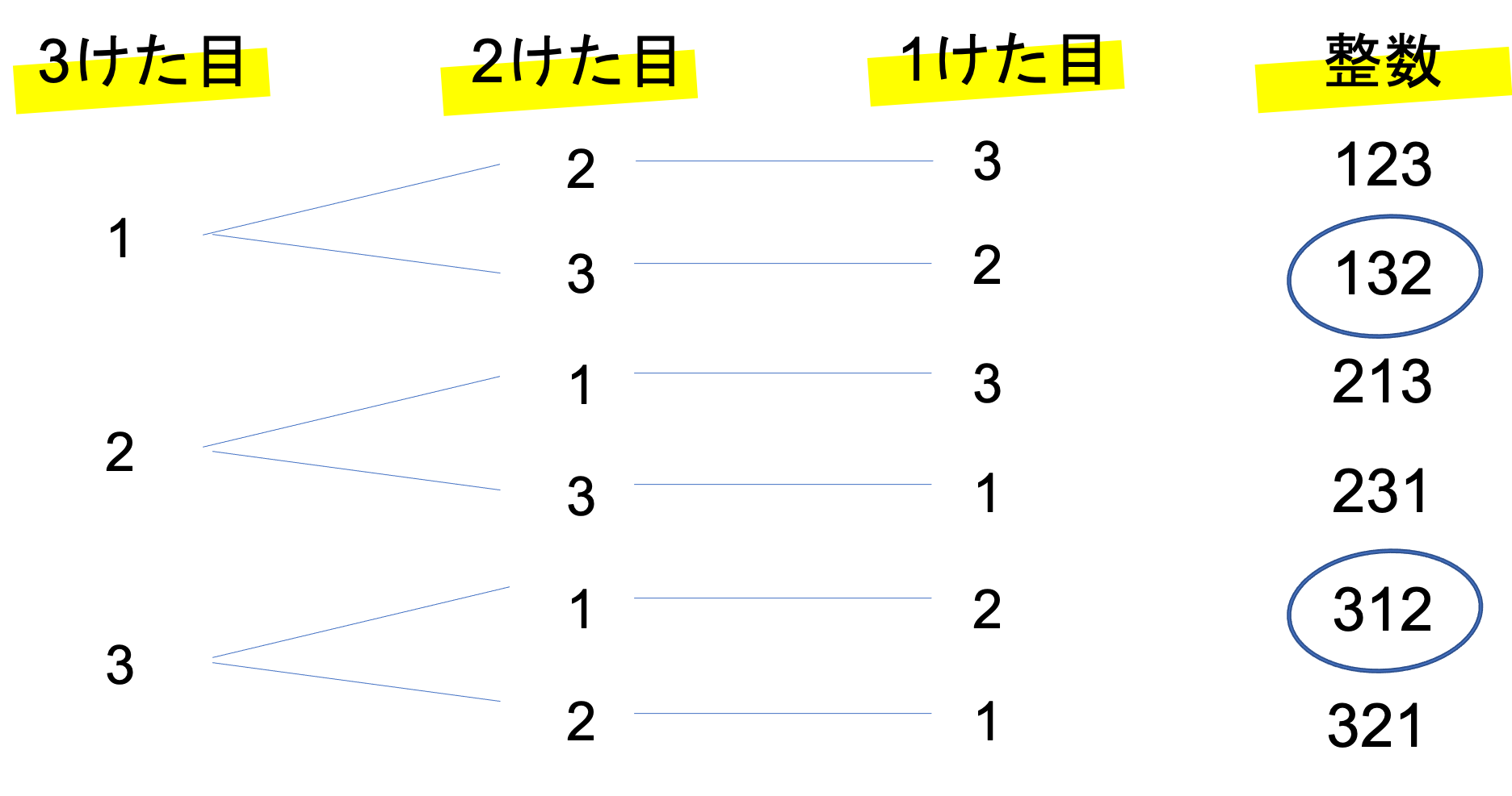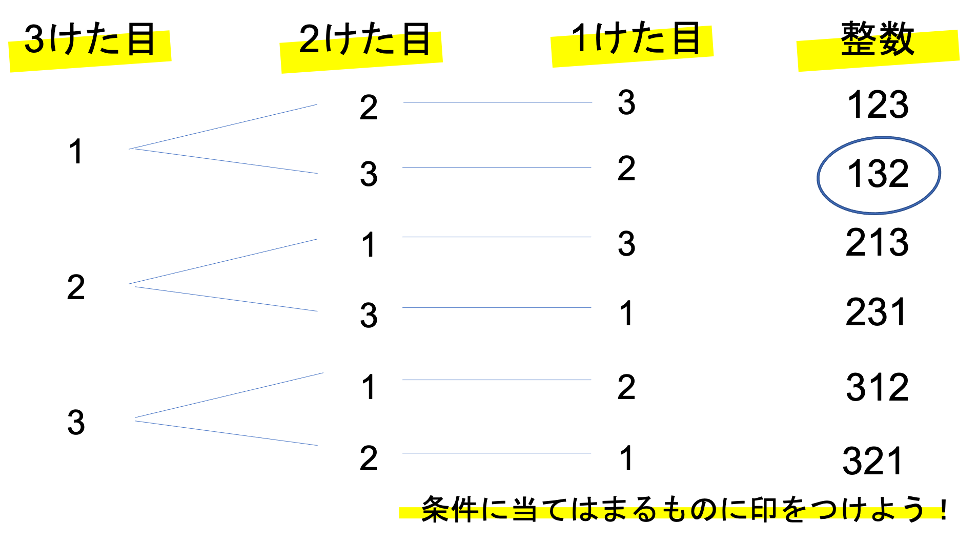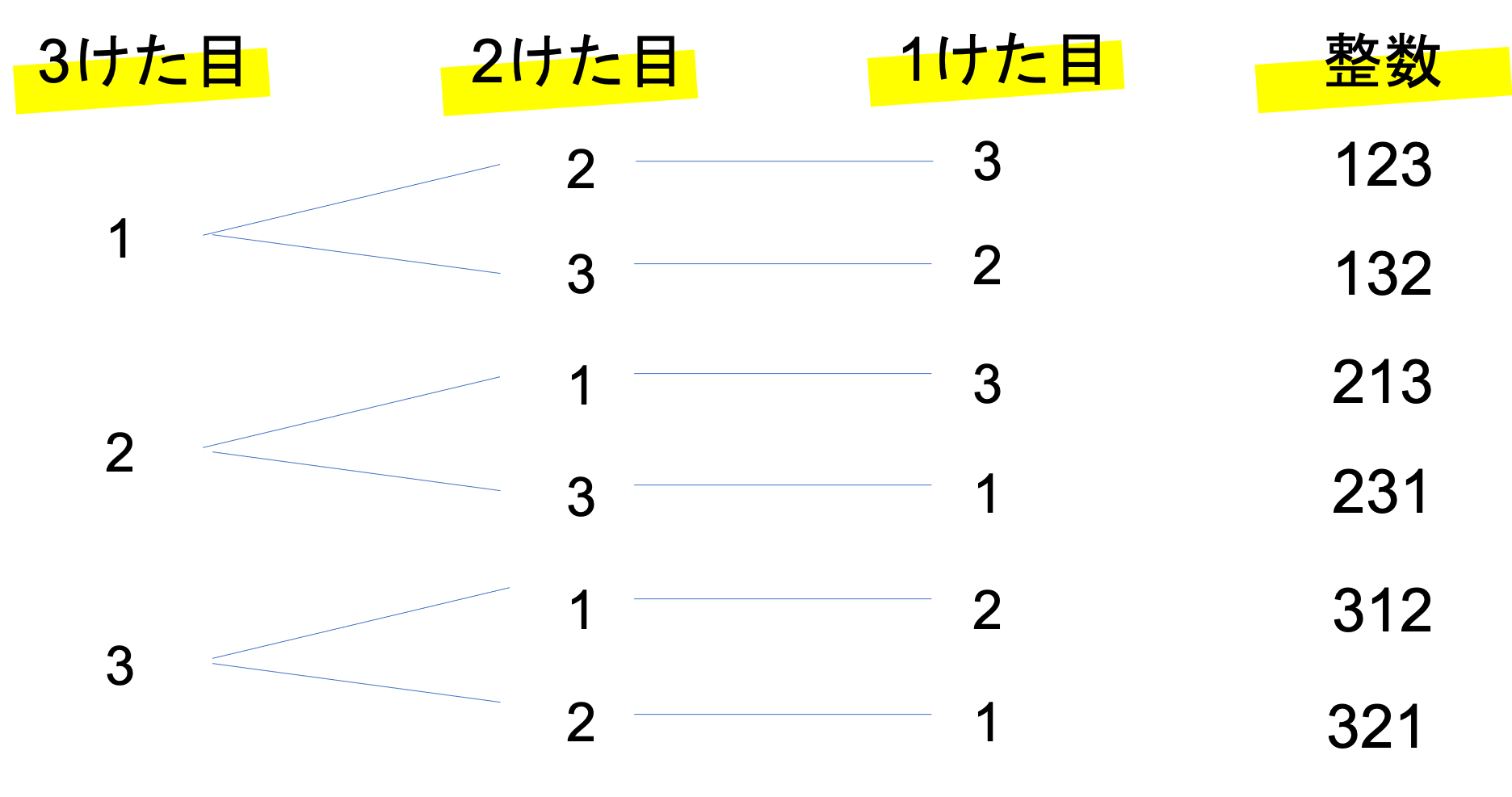 これと同じように他の13・21・23・31・32というカードの並びでも,必然的に1けた目は残った1まいになるので,選択肢はこれ以上増えず,整数の種類は6通りになります。