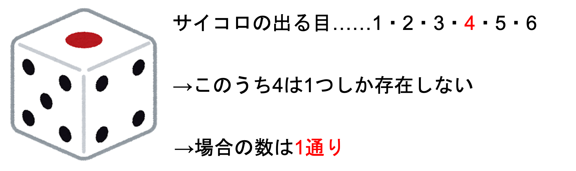まずは基礎的な用語の確認をしていきましょう。初めは場合の数についてです。場合の数とは,ある事柄が起こりうる場合の総数のことです。よく登場するのがさいころの出る目などですね。例えばさいころを1回振って4が出る場合の数,のように聞かれがちです。ちなみにこのときの場合の数は1通りです。これはさいころは1から6までの数しか存在せず,4はこの中に1つしか含まれていないからです。このように場合の数は○通りのように数え上げていきます。