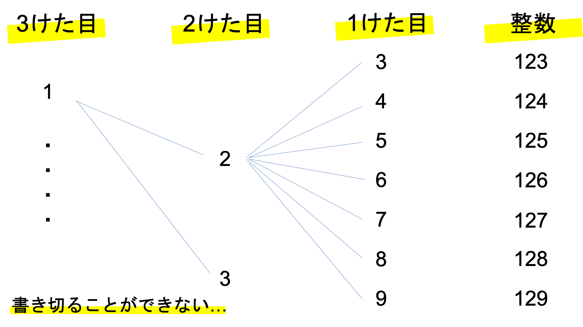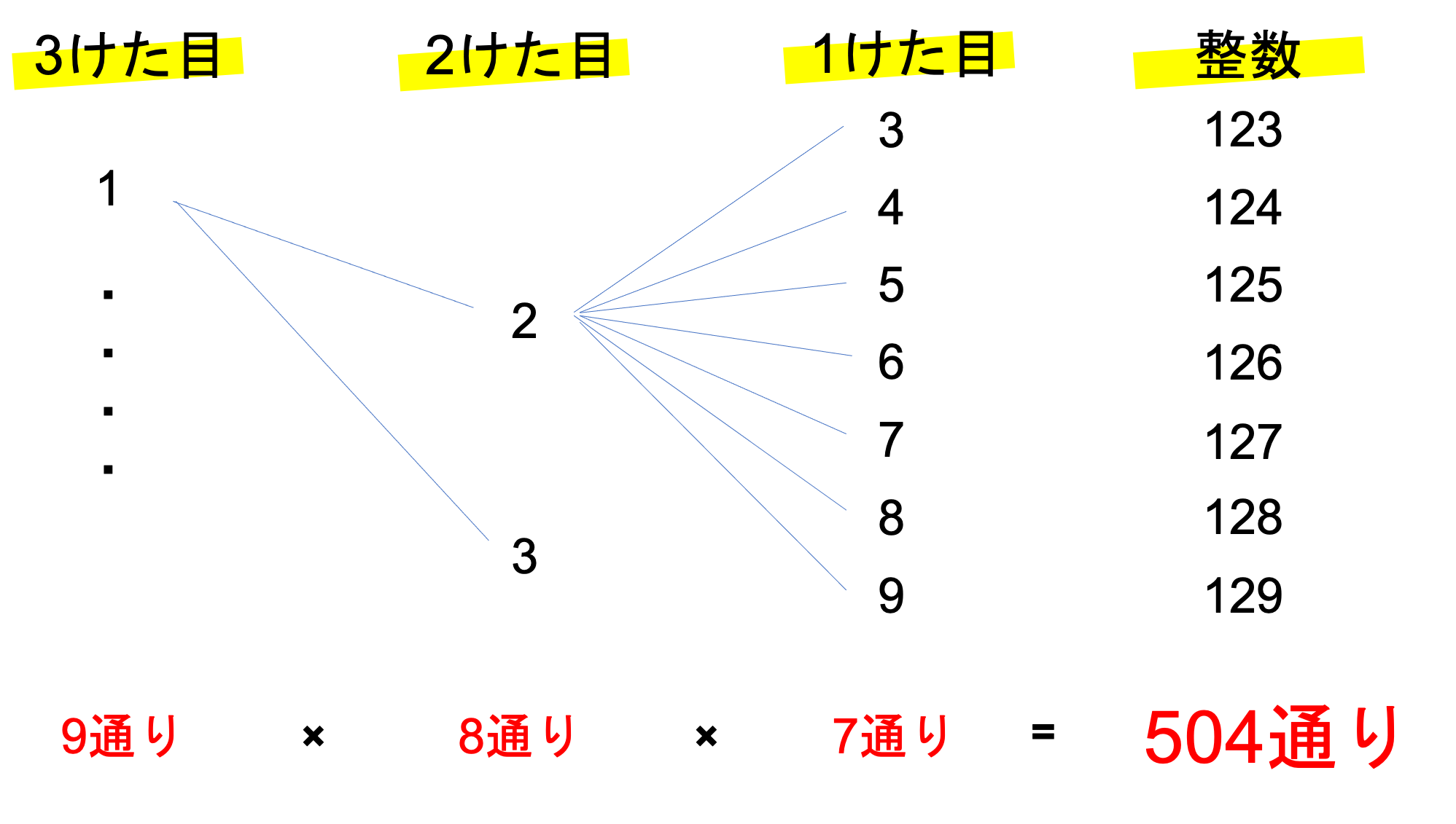 このことから樹形図を書かなくても,3けた目の9通りの数字から8通りの枝が伸び,その9×8本の枝の末端から7通りの枝が伸びているため,9×8×7という式で簡単に表すことがわかります。選択肢の数をかけ合わせることで場合の数は簡単に求めることができるので,樹形図が書きづらいときはこのテクニックを使ってみましょう。