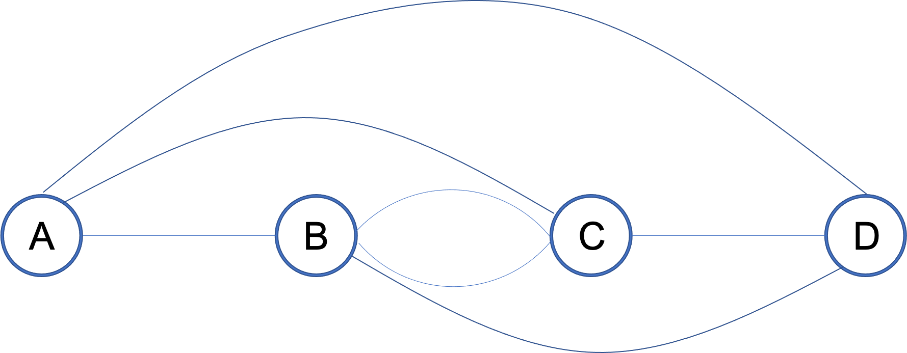 下の図のような道があります。今,AからDまで移動するとき,通り方は何通りありますか。道は戻れますが一度しか通れないものとし,Dについた時点で終了するものとします。