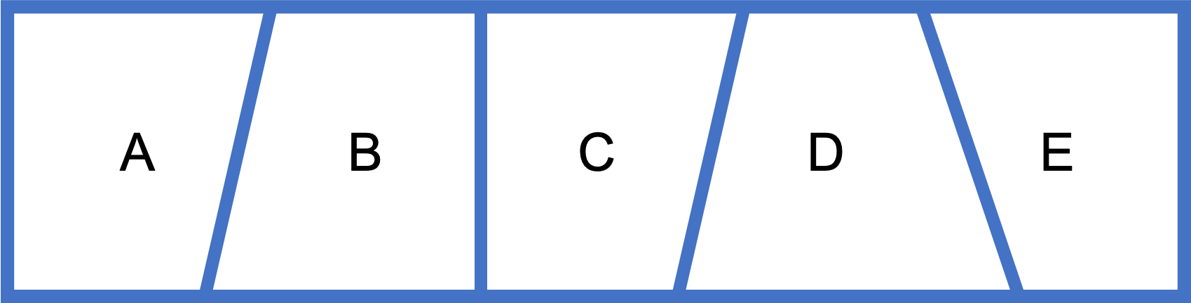 右の図のようなA,B,C,D,Eの5つの部分を,赤,青,黄色の3色でぬります。となりどうしが同じ色にならないようにぬるとき,次の問いに答えなさい。ただし,2色だけでぬってもよいことにします。