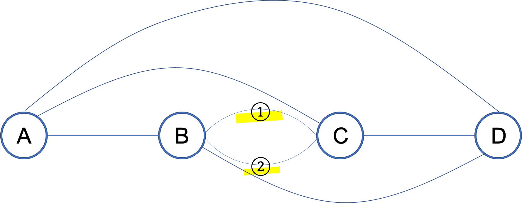 ここでBとCを結ぶ道が2本あることが,問題を少し難しくしていますね。なぜ難しくなるのかというと,BとCを行き来することができるからです。そのためここでは上の道を①・下の道を②を呼ぶことにします。