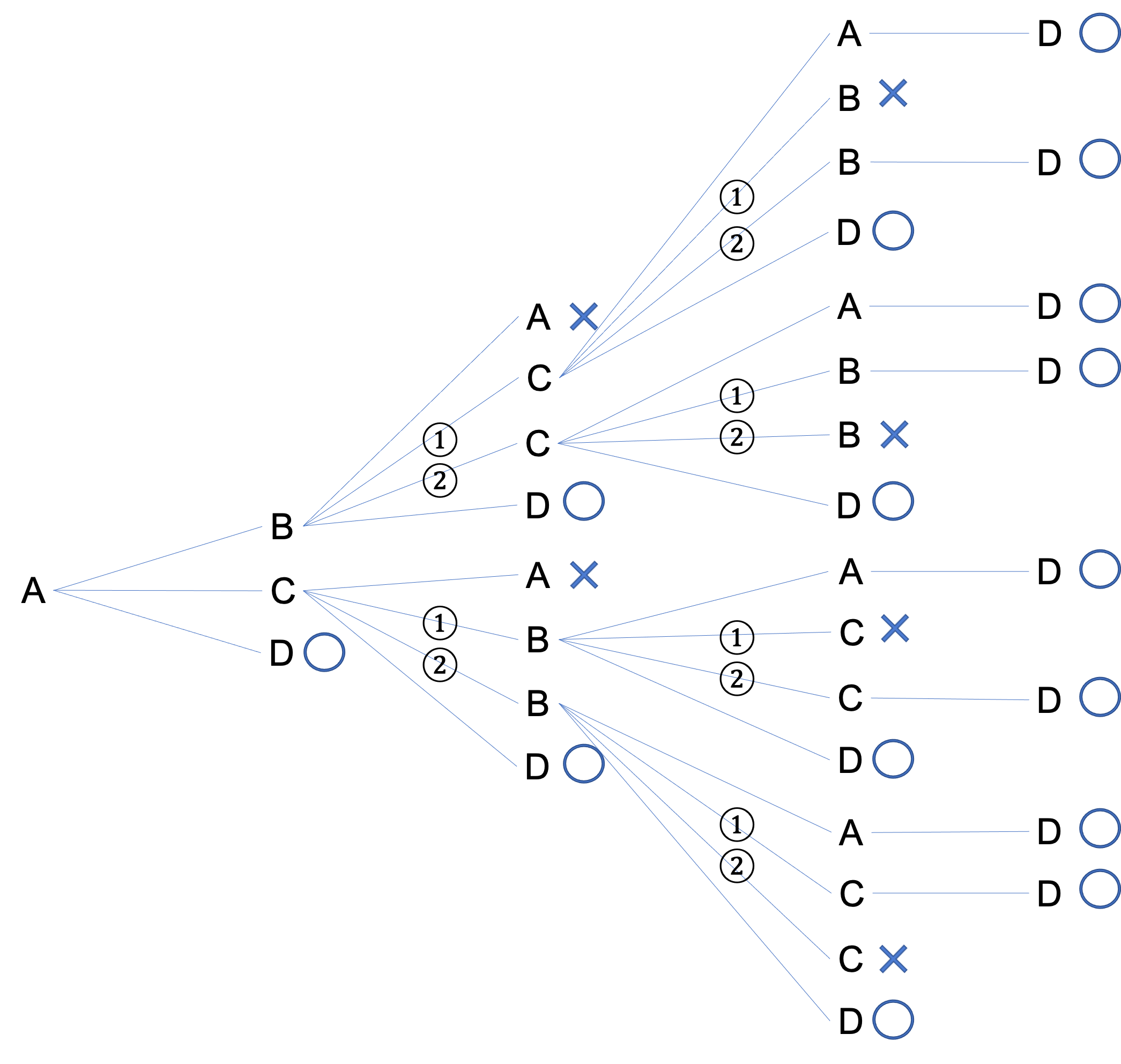 さて,地点AからはB・C・Dに道が伸びています。したがってまず2番目の列にB・C・Dという3つの要素が書き起こせますね。このときDについた時点で終了するため,A→Dという1通りが導けました。ここから終了したルートには○をつけていきます。この要領で各地点から伸びている道の数を考え,樹形図に表しましょう。