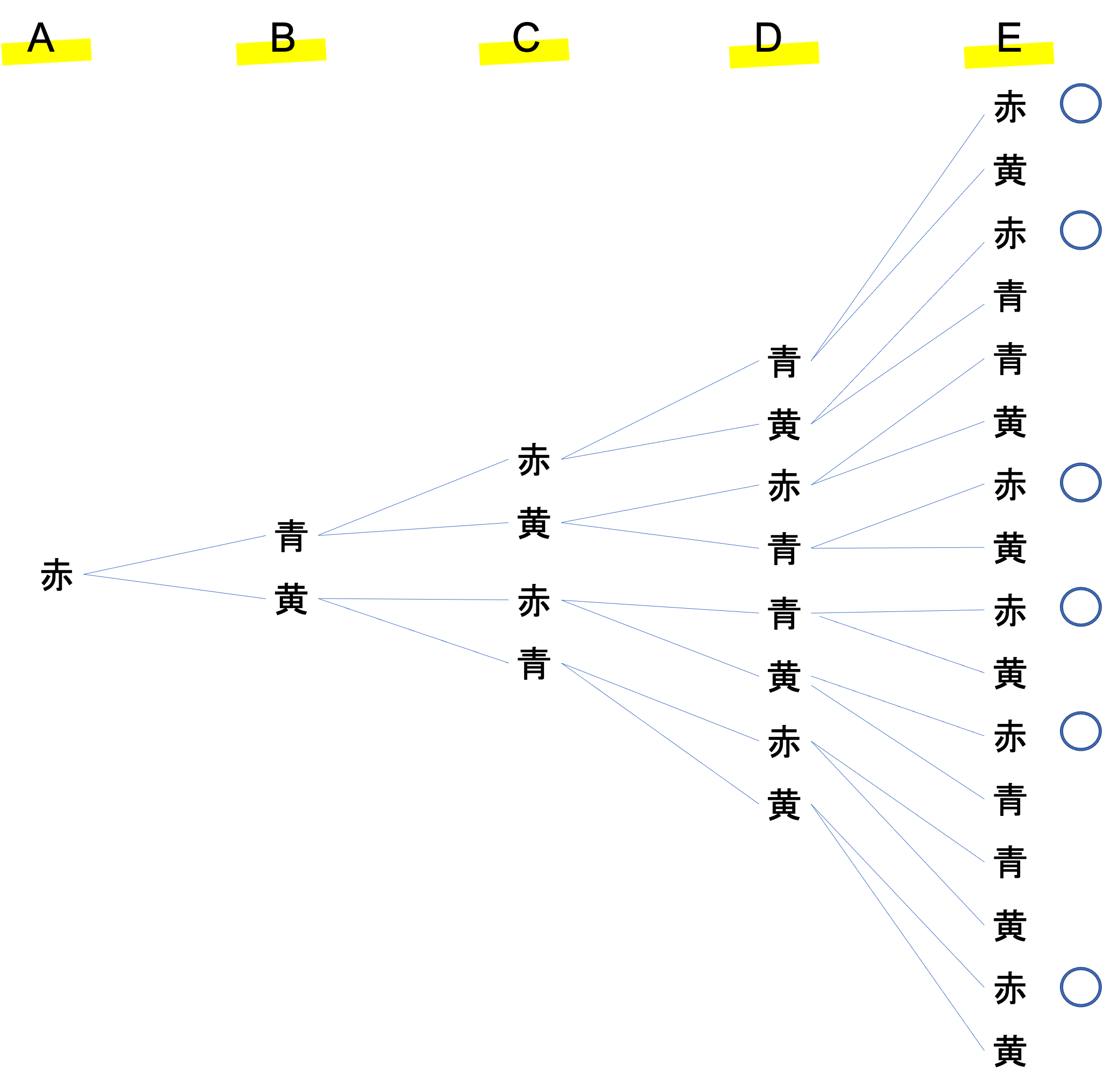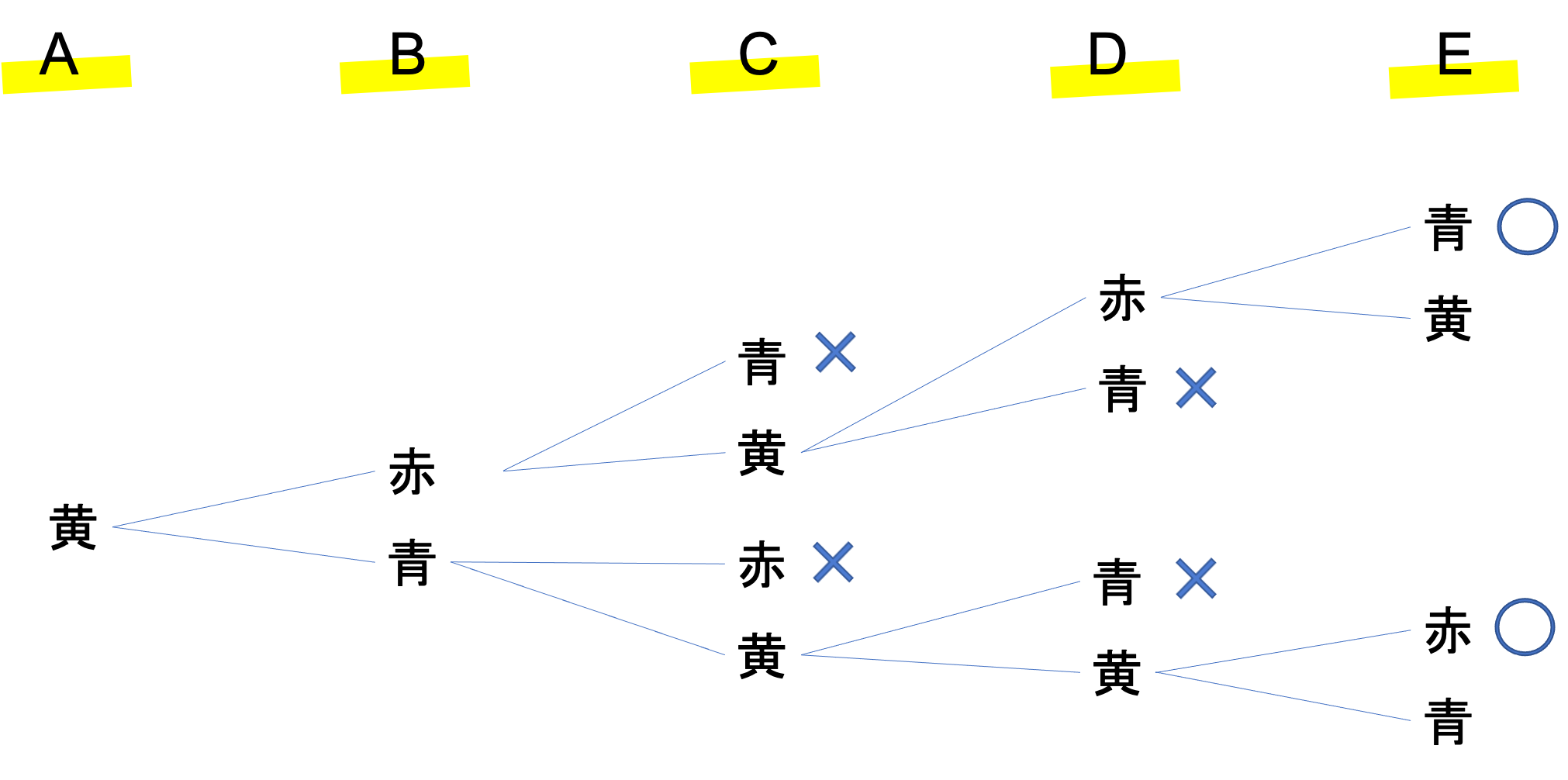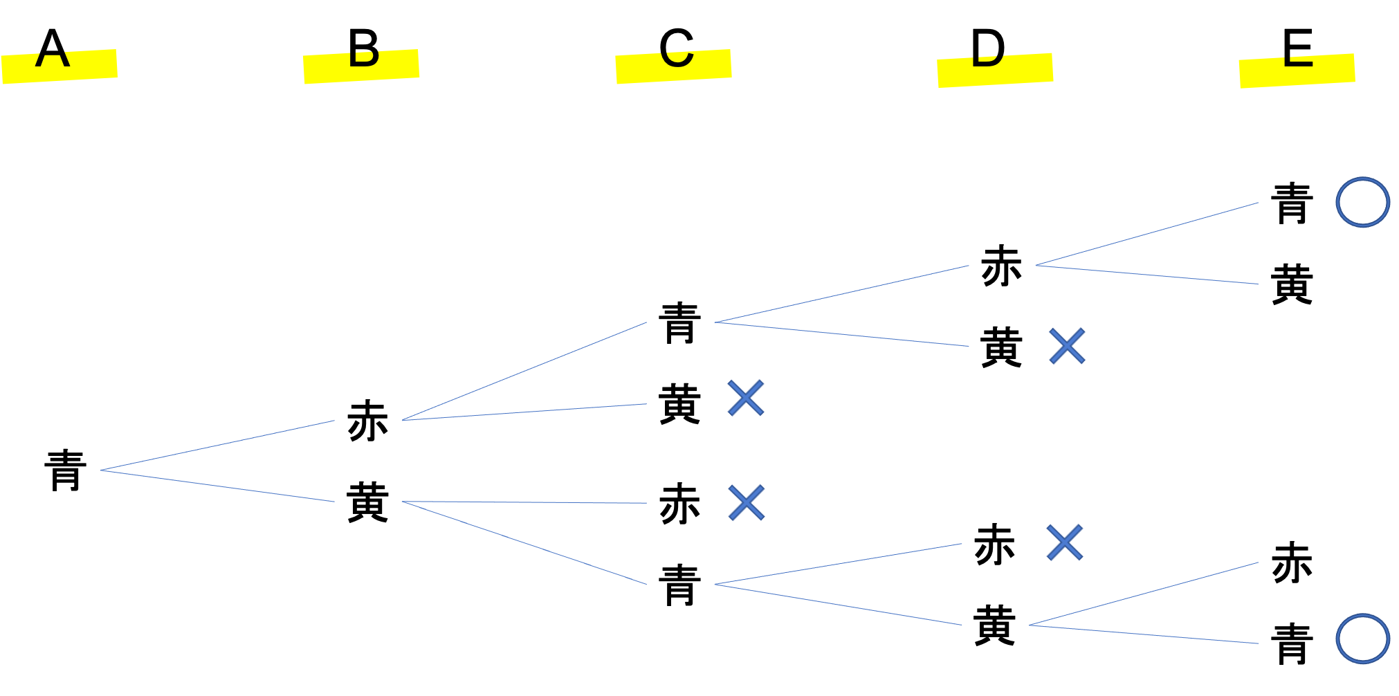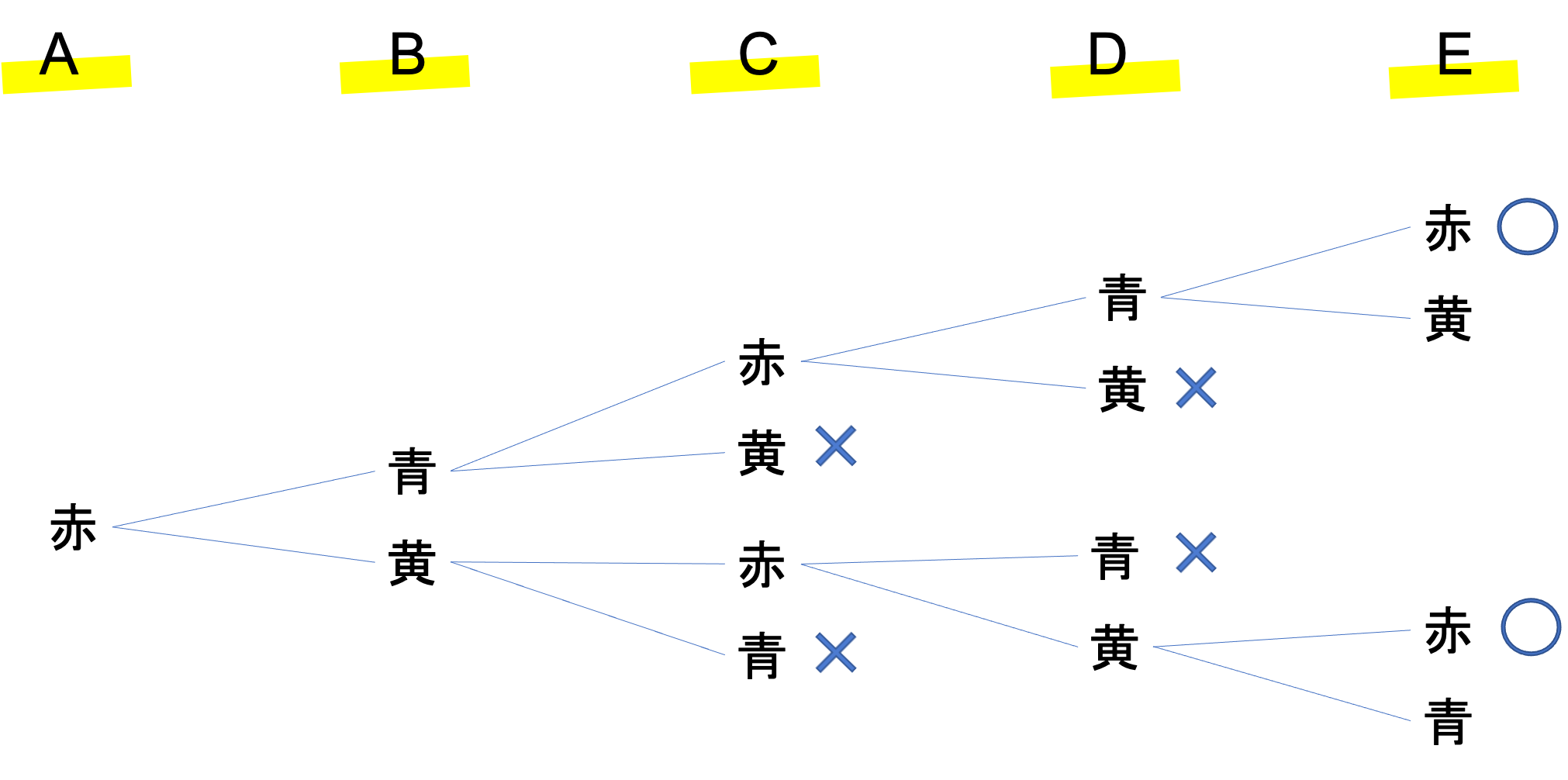このようになりました。なぜ先頭であるAを赤に設定したかというと,最初の問題はAとEが赤色になるぬり方の数が聞かれているからです。この樹形図の中で,Eも赤色でぬられているものに印をつけていきます。