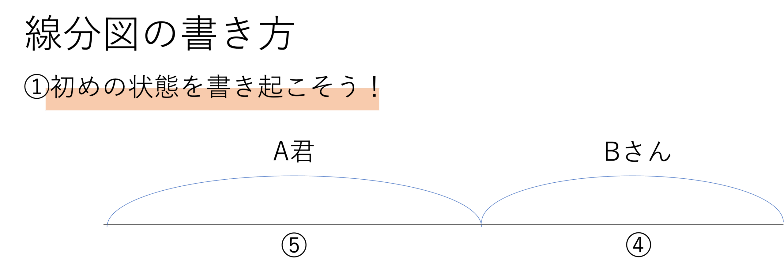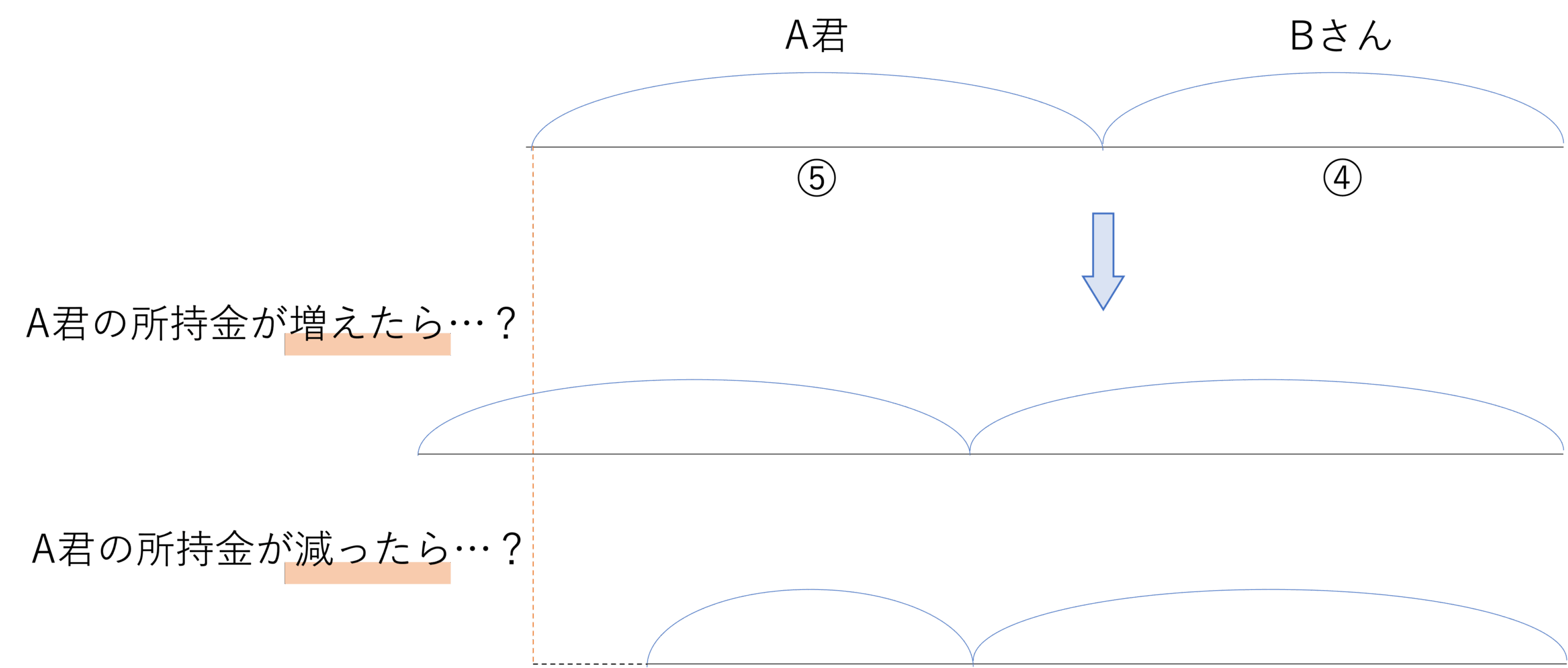 今回は③数が増えたり減ったりするというパターンだったので,A君の線分を短くしてBさんの線分を長くしたのですが,これが①片方が増える・②片方が減る,のいずれかのパターンだったらどうなるでしょうか。そのような場合は,線分そのものを短くしたり長くしたりしてしまえばいいですね。前述したように線分とは全体を表します。今回の全体とはA君とBさんが持っている所持金の合計であり,渡すという操作では全体での量が変わらないので同じ線分に書き起こしましたが,全体の所持金の量が変わるのであればもちろん線分の長さを変えてしまってもOKです。