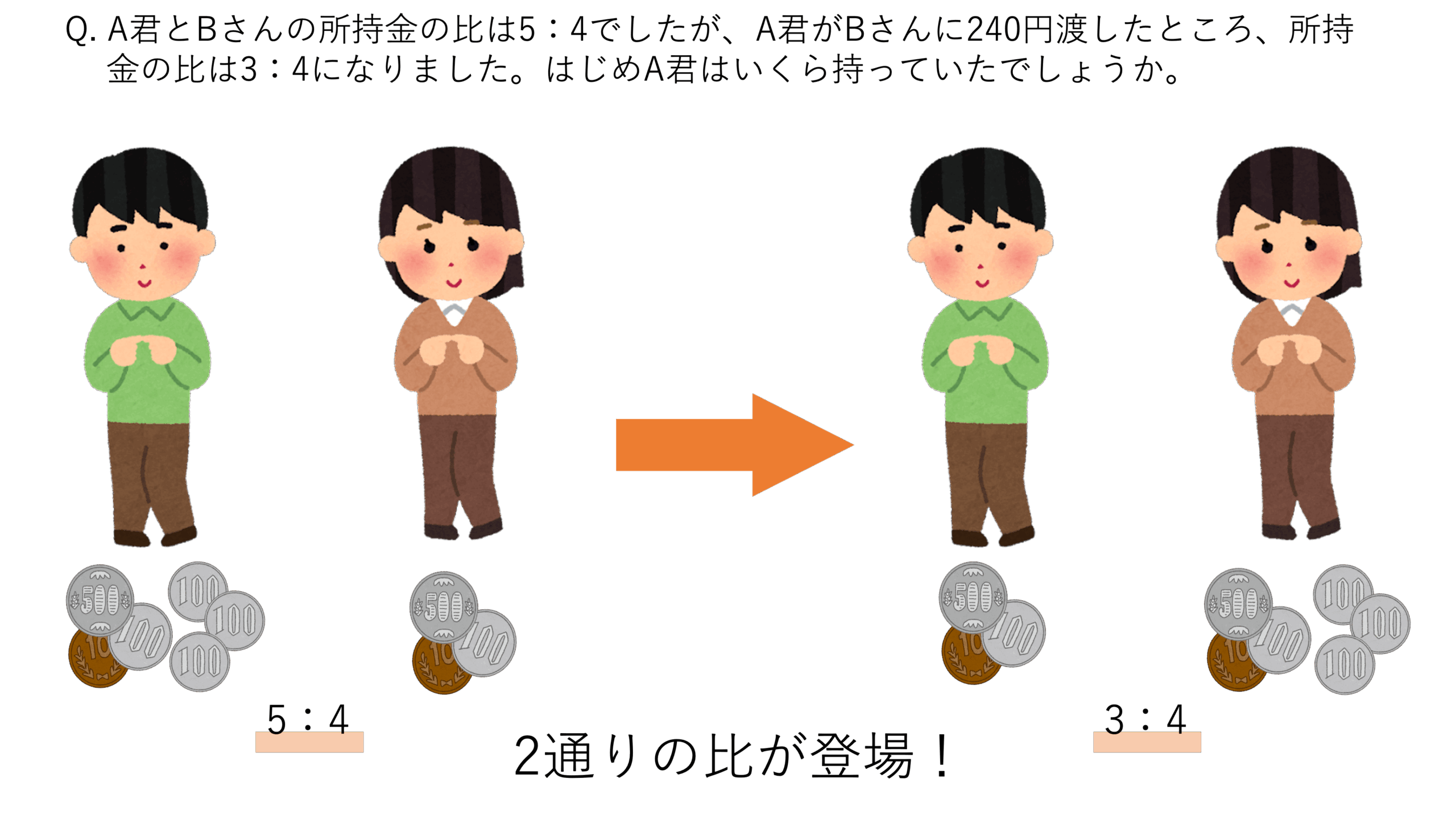 A君とBさんの所持金の比は5:4でしたが,A君がBさんに240円渡したところ,所持金の比は3:4になりました。はじめA君はいくら持っていたでしょうか。
