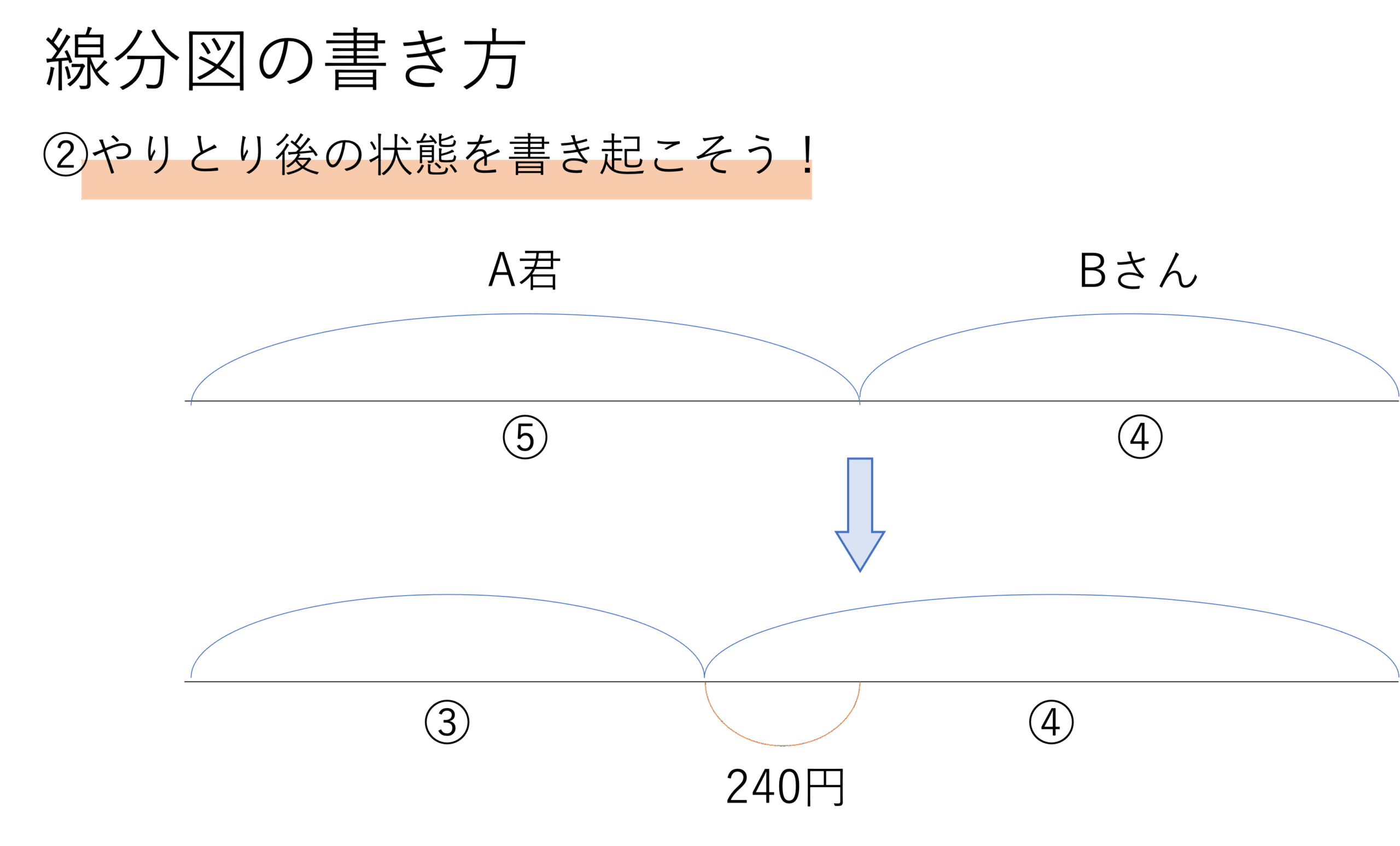 そうして初めの状態が書き表せたなら,今度はもう一本別の線分を書いて,A君がBさんに240円を渡した後の関係を書きましょう。このとき重要なのが,「渡す」ということをA君が240円失ってBさんが240円獲得した,と読み替えることです。こうすることでやりとりを反映させやすくなります。
