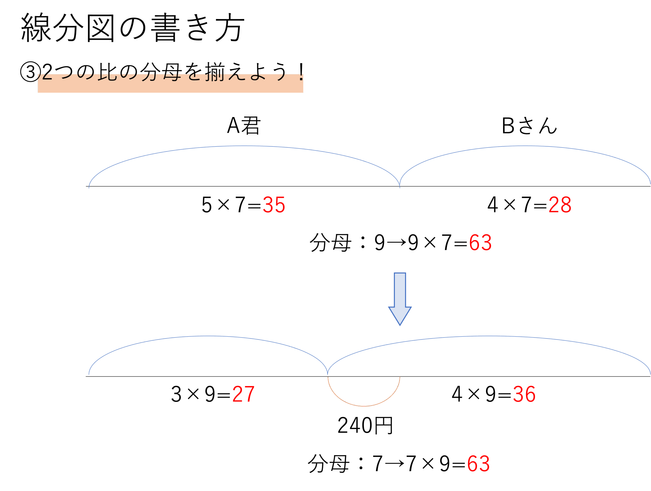 - 比の分母を揃えて数字と割合を重ね合わせる!