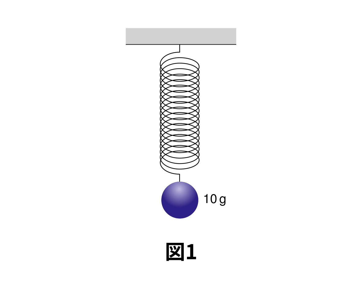 下の図1を見てください。ばねはおもり\(10\,\mathrm{g}\)あたり\(1\mathrm{cm}\)だけ伸びるものとします。また、ばねの重さは無いものとします。おもりの重さを\(10\,\mathrm{g}\)とすると、ばねがおもりから受ける力は何\(\,\mathrm{g}\)になるでしょうか?(正確には、「重さ」と「力」は違うのですが、同じようなものとして考えます。)また、ばねの伸びは何\(\,\mathrm{cm}\)になるでしょうか?