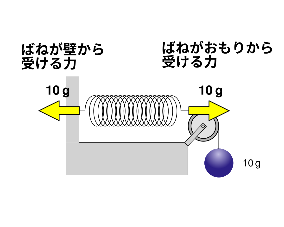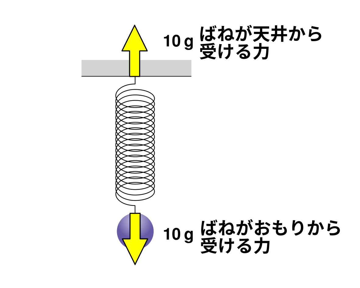 いま、ばねはおもりによって\(10\,\mathrm{g}\)の力で下に引っ張られていましたよね。なので、ばねは天井からも\(10\,\mathrm{g}\)の力で上に引っ張られています。なので答えは\(10\,\mathrm{g}\)です。