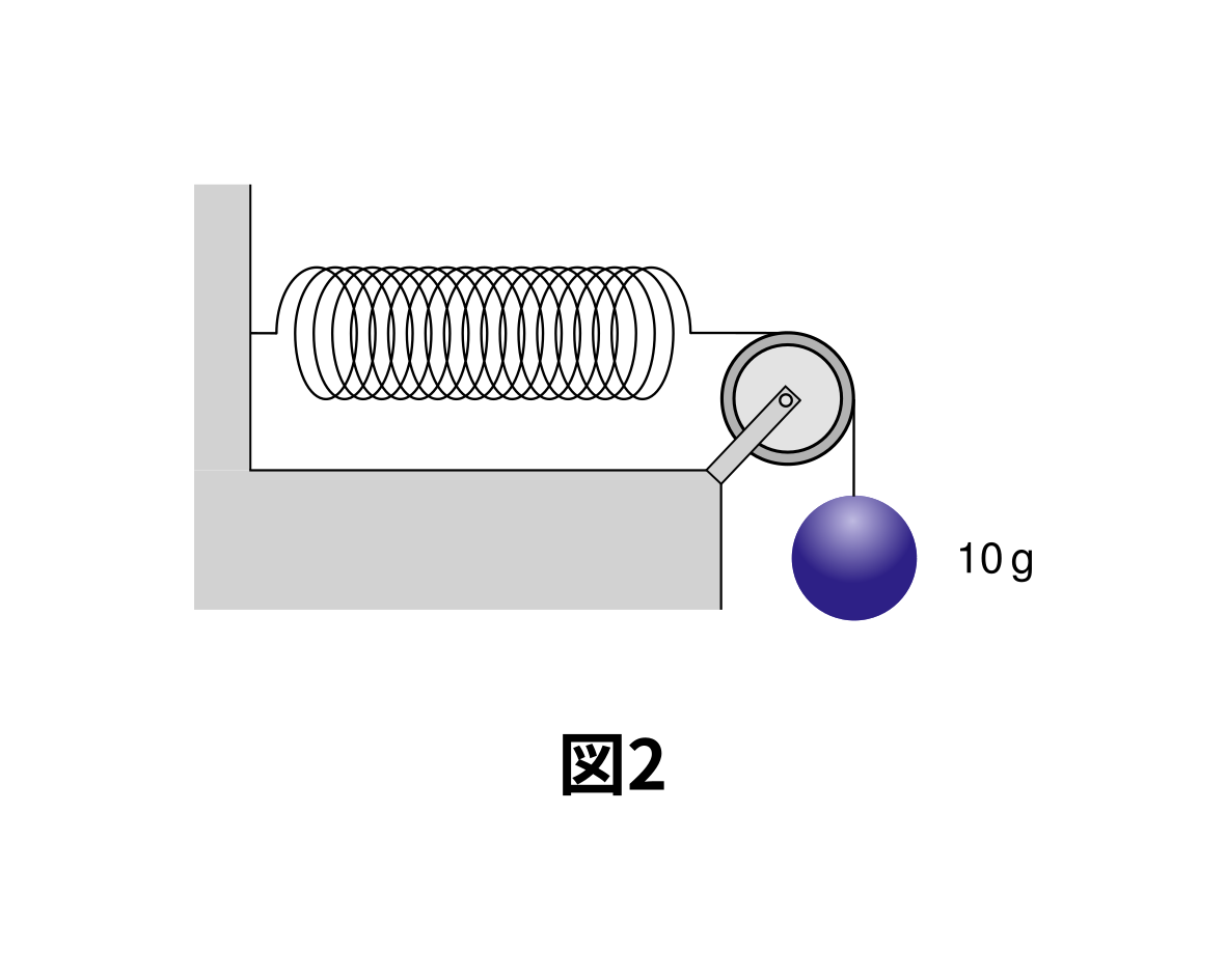 下の図2を見てください。ばねが滑車を通したおもりから受ける力と、壁から受ける力はそれぞれ何\(\,\mathrm{g}\)でしょうか。また、ばねの伸びは何\(\,\mathrm{cm}\)になるでしょうか?