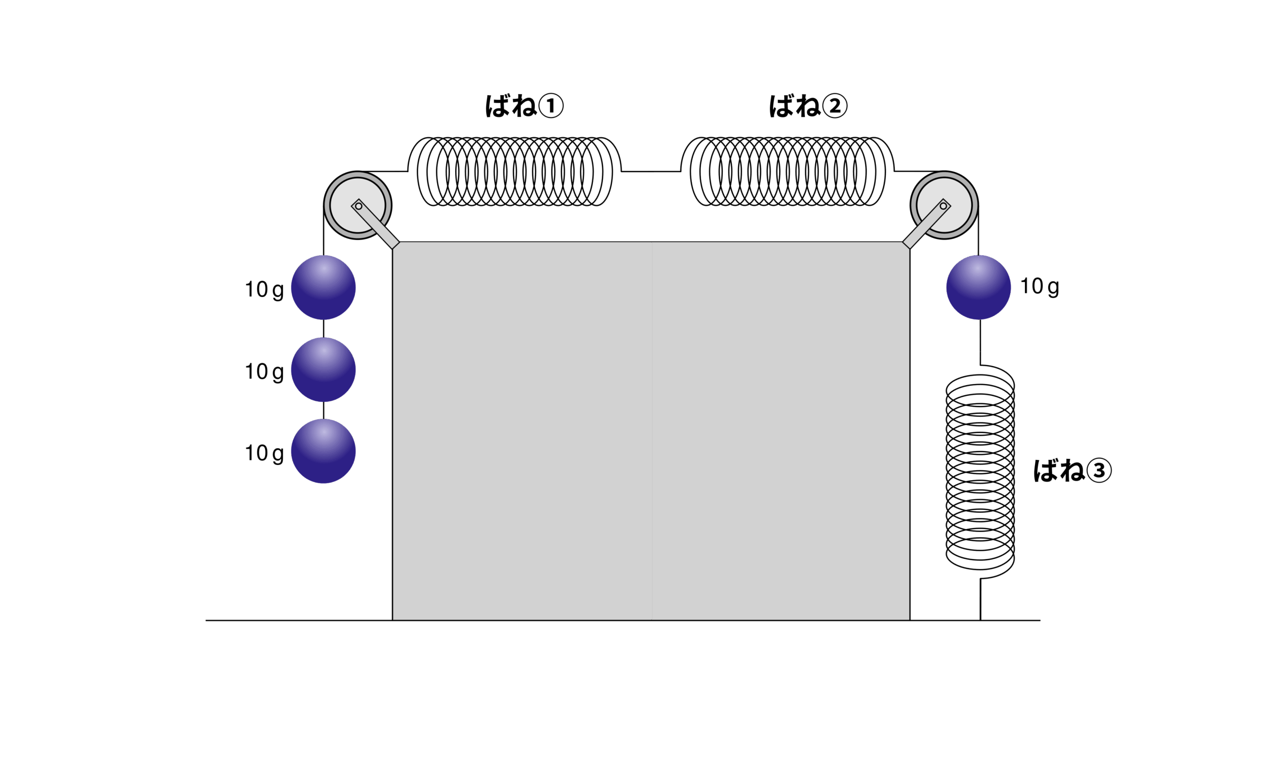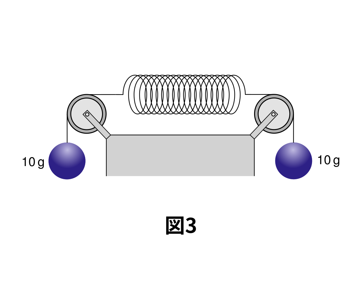 次の図3を見てください。ばねが滑車を通したおもり①と②から受ける力は、それぞれ何\(\,\mathrm{g}\)でしょうか。
