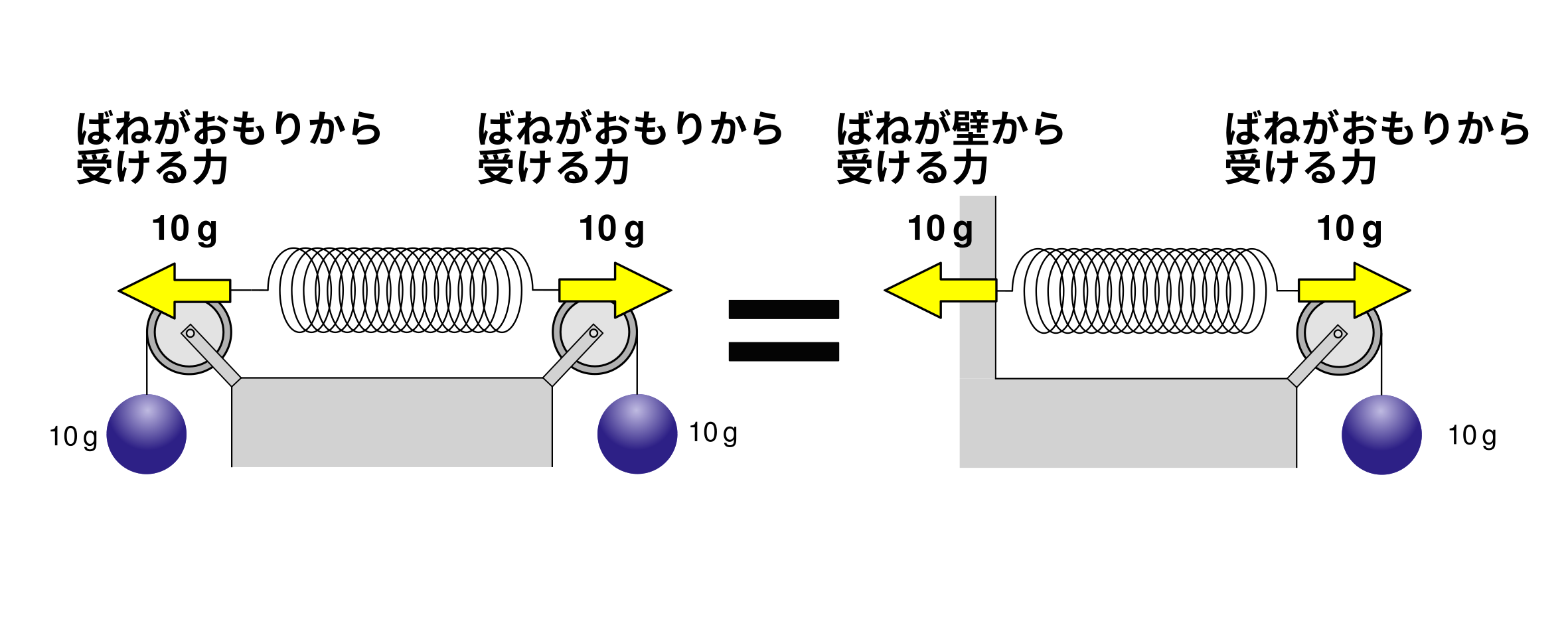 今回の場合はどうでしょうか。今回も「ばねが両側から\(10\,\mathrm{g}\)の力で引っ張られている」状況ですよね? したがって、ばねにかかる力は前の状況と同じ、つまり、ばねの伸びも同じく「\(1\,\mathrm{cm}\)」になります! それでもわからないという人は片方のおもりに注目して、もう片方を壁に置きかえてしまうといいでしょう。ばねにかかる力が同じであれば、このように置きかえができます。そうすると、ばねの伸びは明らかに\(1\,\mathrm{cm}\)ですね。