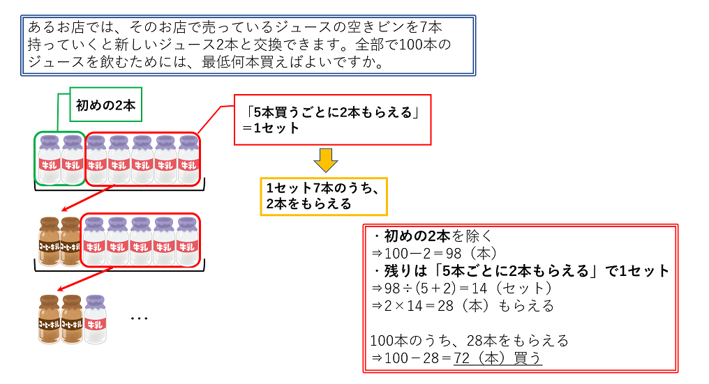 (問題)あるお店では、そのお店で売っているジュースの空きビンを7本持っていくと新しいジュース2本と交換できます。全部で100本以上のジュースを飲むためには、最低何本のジュースを買えばよいですか。
