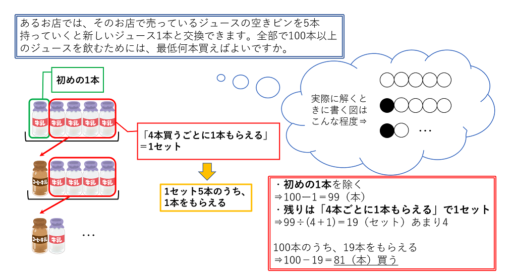 (問題)あるお店では、そのお店で売っているジュースの空きビンを5本持っていくと新しいジュース1本と交換できます。全部で100本以上のジュースを飲むためには、最低何本のジュースを買えばよいですか。