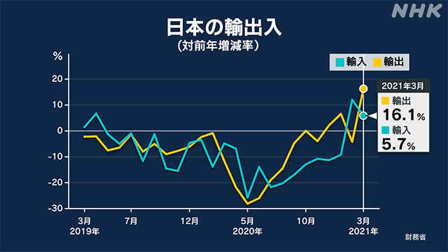 また、2020年は新型コロナウイルスの影響を受け、2020年の輸出は前年比11%減の68.4兆円、輸入は前年比14%減の67.8兆円となり、リーマンショック以来の落ち込みとなりました。しかし、2021年に入り落ち込んだ輸出入は右肩上がりに回復し、2021年3月の段階では輸出額が輸入額を超え貿易黒字となっています。