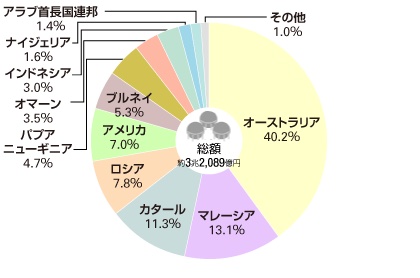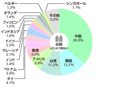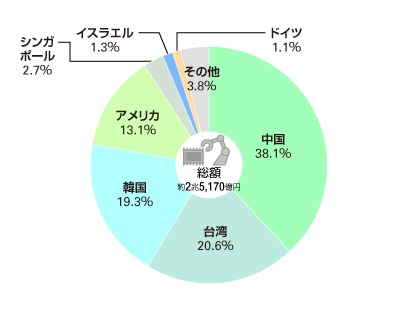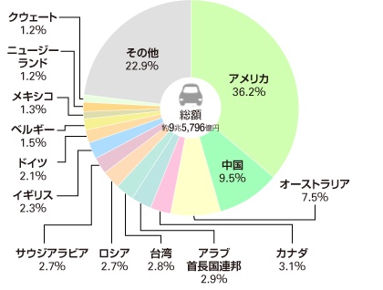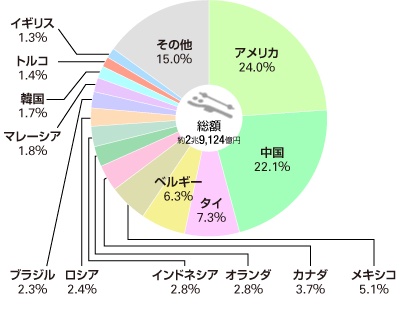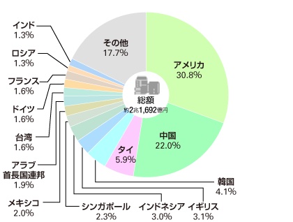 輸出相手国は経済成長が著しいアジア諸国が多く、欧米諸国ではアメリカ、ドイツが多くなっています。