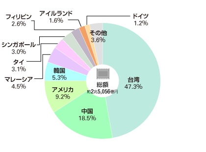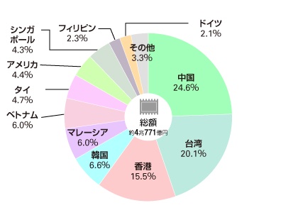 半導体をはじめとした電子機器やプラスチックなどの化学製品などアジア各国に輸出が集中しています。その背景には、日本国内より人件費や材料費が安くなることから日本の企業の多くがアジア各国に工場を構えたことがあります。