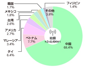 そのほか日本企業が海外に建てた工場でつくられた製品を逆輸入や、スマートフォンなどの通信機は中国、半導体等電子部品は台湾と電気機器も多く輸入しています。