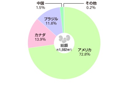 資源だけでなく食料自給率も低い日本では、とうもろこし、小麦、大豆などの食料も輸入に頼っています。そして食料品の輸入相手国の大部分を占めているのはアメリカです。