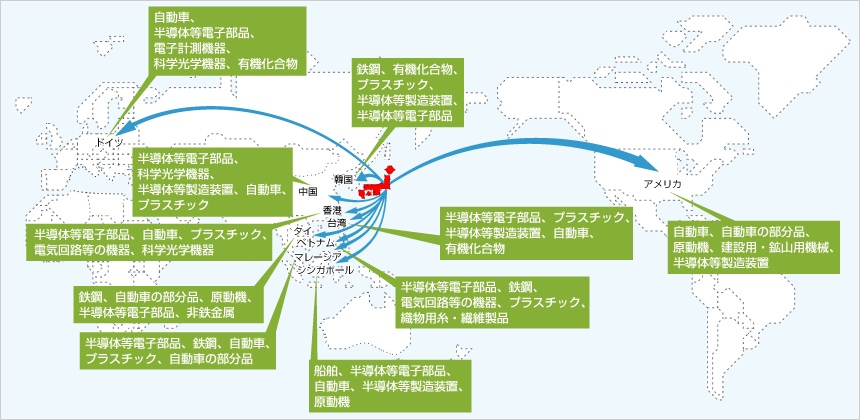 輸出品目の大部分を占めるのは自動車や半導体などです。