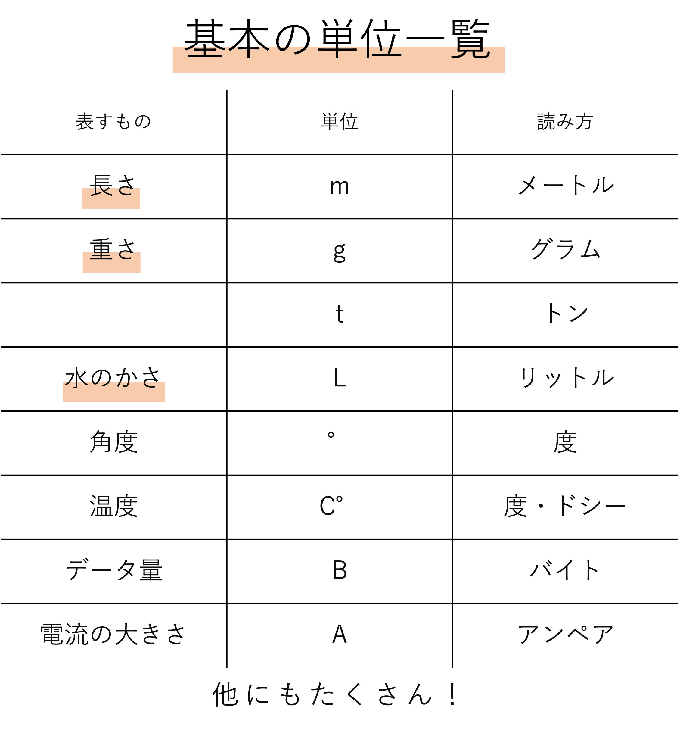 しかしこれらの情報は単位があってはじめてきちんと比べられるものですよね。例えば先に挙げた長さで言うのであれば,m(メートル)をはじめとした基準がないと,爪の長さくらいとか腕の長さくらいとか,そういった曖昧なものでしか量を計ることができないので,きちんとした比較ができなくなってしまうのです。そこでいつでもどこでも正しい比較ができるように,単位という国際的に定められた基準が作られたのです。