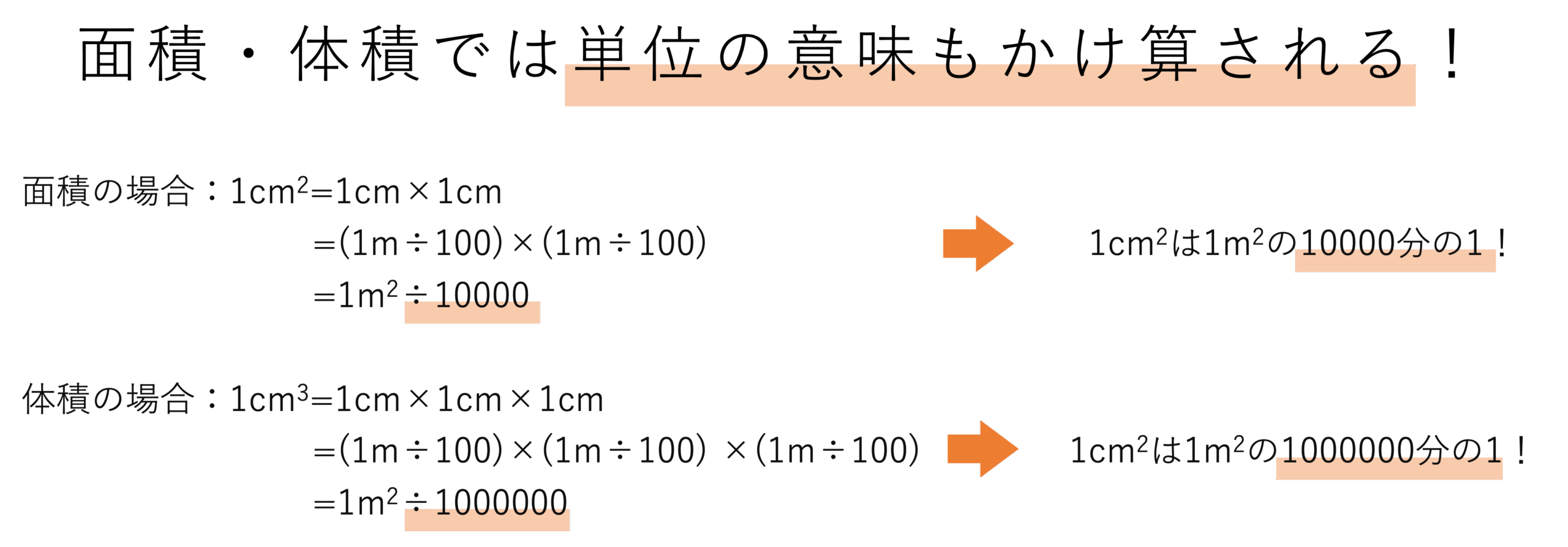 はじめに面積について確認していきましょう。小学校で習う体積の単位にはmm2(平方ミリメートル)・cm2(平方センチメートル)・m2(平方メートル)の3種類が挙げられます。これらはどれも同じ単位の長さを2回掛け合わせている,ということを意味します。例えばcm2(平方センチメートル)であれば,1cmという単位が2回かけ算されているわけです。つまり1cm2=1cm×1cmという関係が成り立ちます。この関係については学校でも習っているはずなので問題ないでしょうが,ここで重要なのは記号の意味も2回かけられているということです。例えば先ほどの1cm2=1cm×1cmにおいて,cmのc(センチ)の部分は100分の1を意味していましたが,cm同士をかけ算することで100分の1も2回かけられる,つまり10000分の1になるのです。これを言い換えると1cm2は1m2を10000の1にしたもの,と表すことができます。同様に考えていくと,1mの1000の1を示す1mmを2回かけた1mm2は,1000分の1を2回かけて,1m2の1000000分の1になるのです。面積の単位の変換はなかなか手強い単元ですが,このように単位の意味も2回かけられていると覚えておくと簡単に変形ができるようになりますよね。