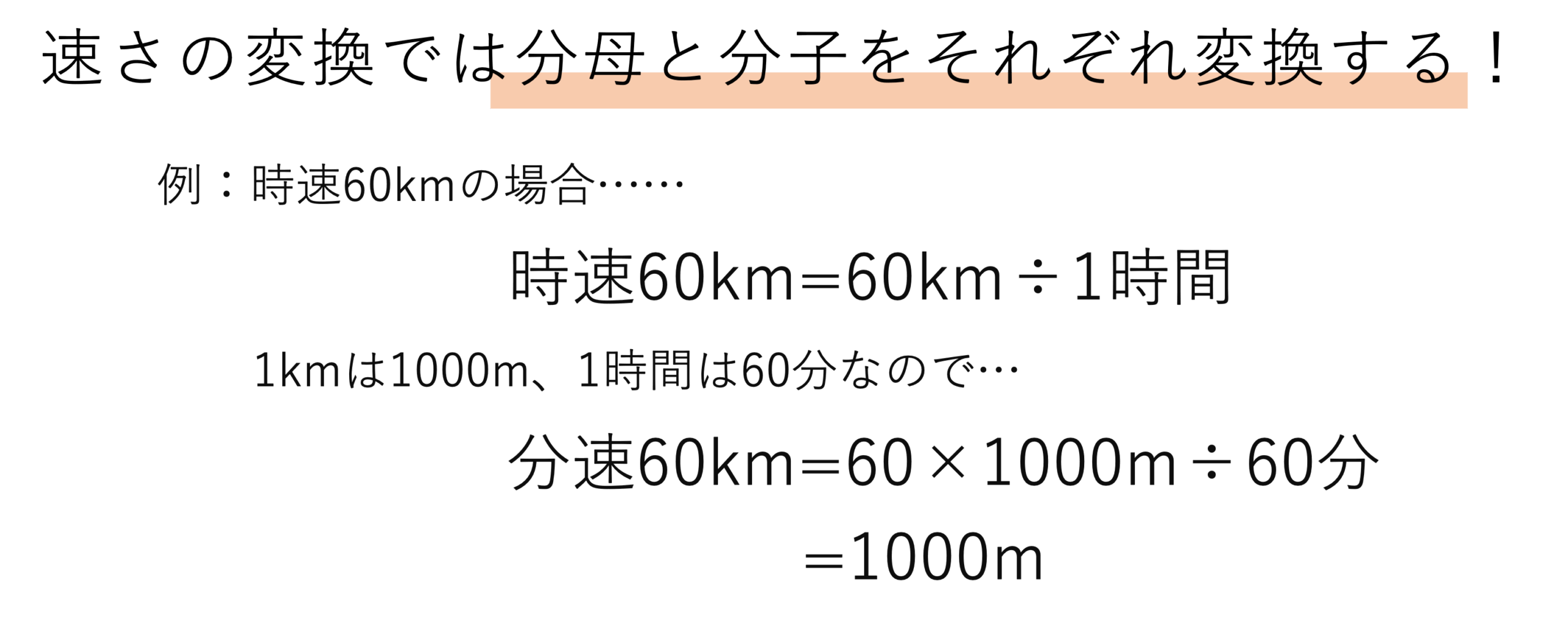 ここからは速さの変換について見ていきましょう。例として時速60kmを分速〇〇mの形に直す場合を考えてみます。上の速さの定義から,時速60kmというのは1時間という一定の時間に60km進むということを指します。式に直すと60km÷1時間という形になりますね。これを分速〇〇mという形に直すには,距離と時間をそれぞれ変換しなければなりません。まず距離ですが,k(キロ)というのは1000倍を表す記号だったので,60km=60000mと変換することができますね。次に時間ですが1時間は60分と等しいので,これらのことから上の式は60000m÷60分という形に直せます。これを計算すると1000となるので,時速60kmは分速1000mという形に変えられる,ということが分かります。このように速度の単位の変換は難しく感じやすいところですが,分子と分母をそれぞれ上で確認したような接頭語などを参考に置き換えると覚えておけば,簡単に計算することができますよね。このような変換は絶対落としたくない小問集合でも出てきやすいので,確実に解けるように慣れておきましょう。