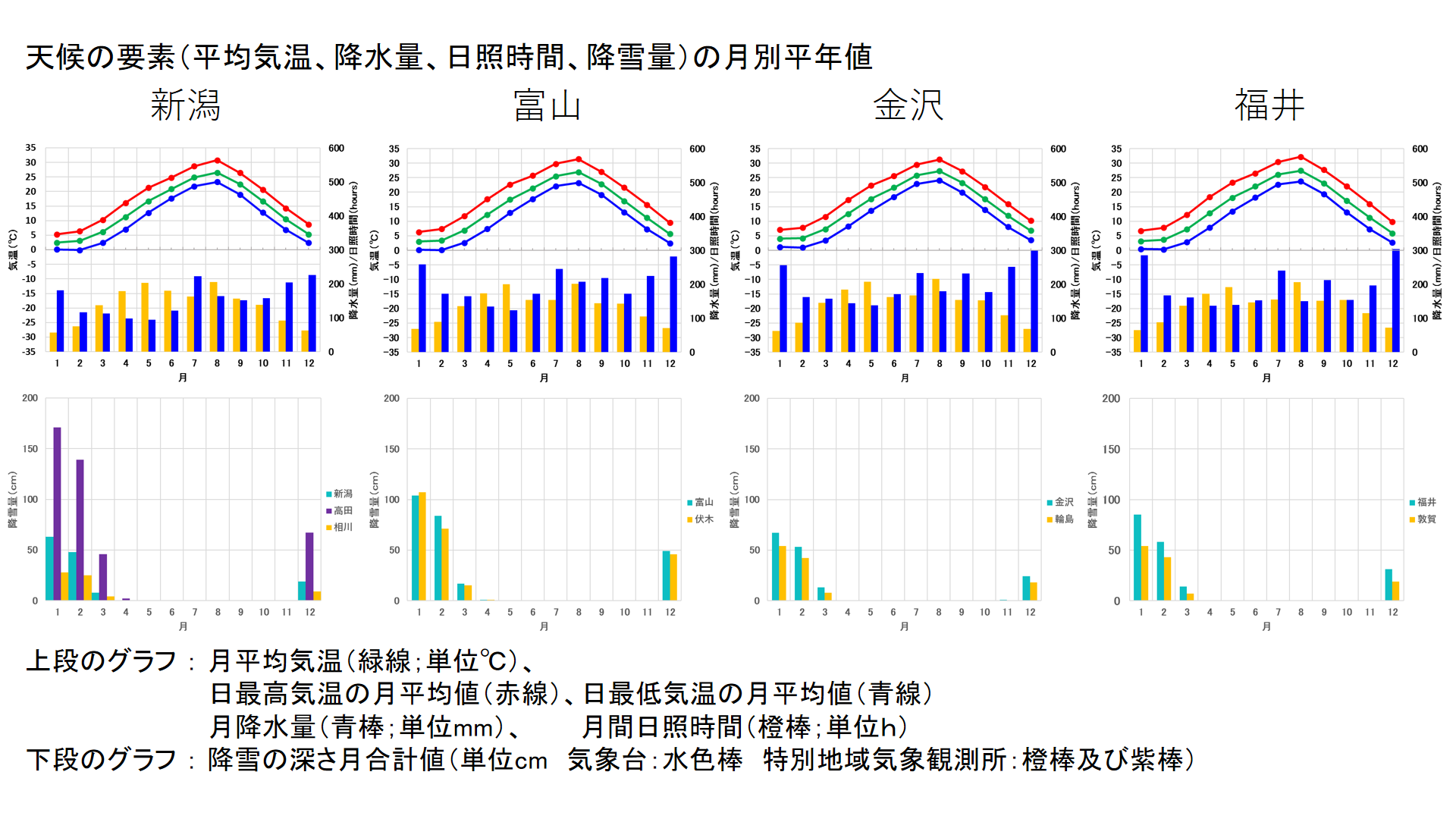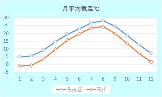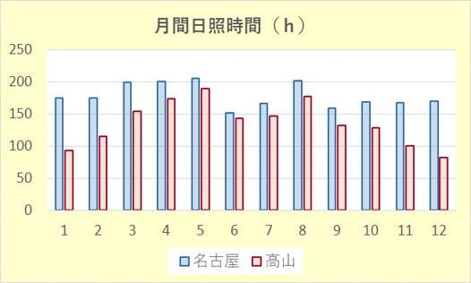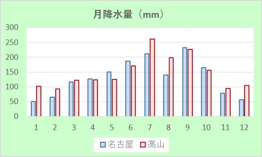 上の図は太平洋側の名古屋、内陸の高山を比較したものになります。太平洋側は年間を通して比較的温暖な気候で夏に降水量が多くなり、沿岸部は降雪が年間を通じて殆どありません。内陸は高地が多く、標高が高いため、昼と夜の温度差が大きいのが特徴です。また冬は東海側と比べ厳しい寒さになります。