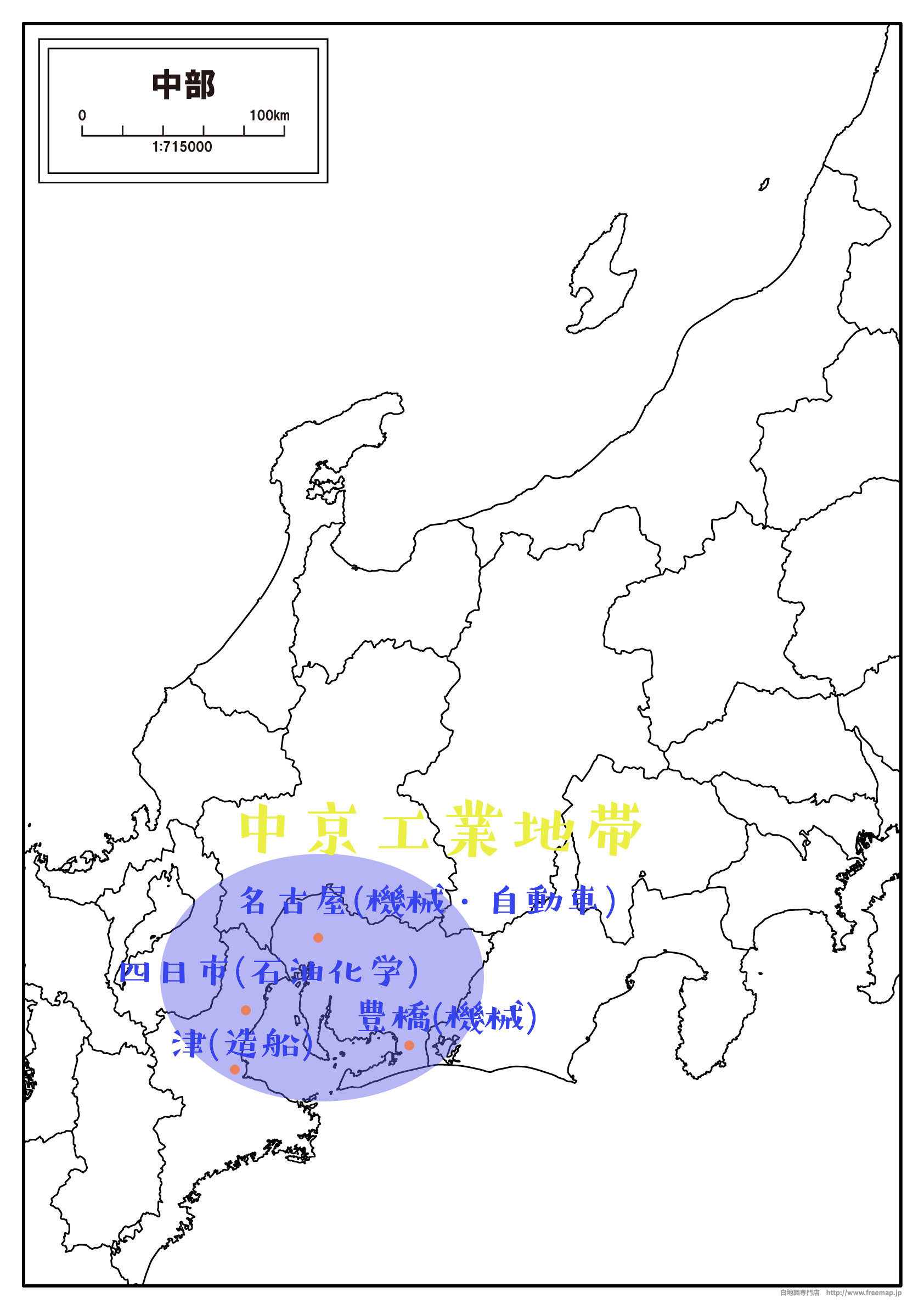 それでは,まずは中京工業地帯の場所から確認していきます。工業地域・工業地帯について勉強していく上で,どこに位置するかということを覚えておくことは何より重要です。都道府県から工業地域・工業地帯の名前を答えさせる問題を始め,受験においてこれらの知識は周りと差をつけられないために必要となります。