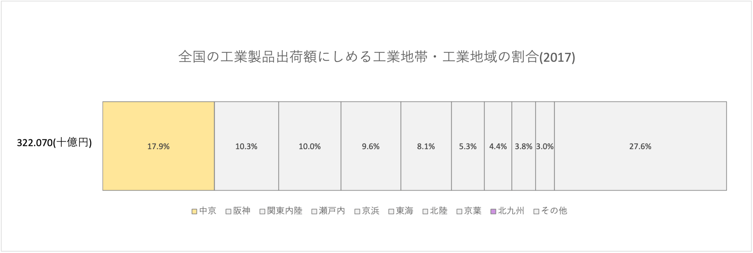 それではここからは中京工業地帯の工業の特徴について見ていきましょう。第1回から第7回までの記事で繰り返していますが,今回の記事でも同じように出荷額の高さと工業種類別の割合に着目していくことにします。この2つの要素に目を向けることで,その工業地域・工業地帯が日本においてどのようなポジションに位置しているのか・他の地域や地帯と何が違うのか,を知ることができます。出荷額と種類別の割合の詳しい意味は第1回の瀬戸内工業地域編で紹介していますので,よろしければそちらを参照してください。
