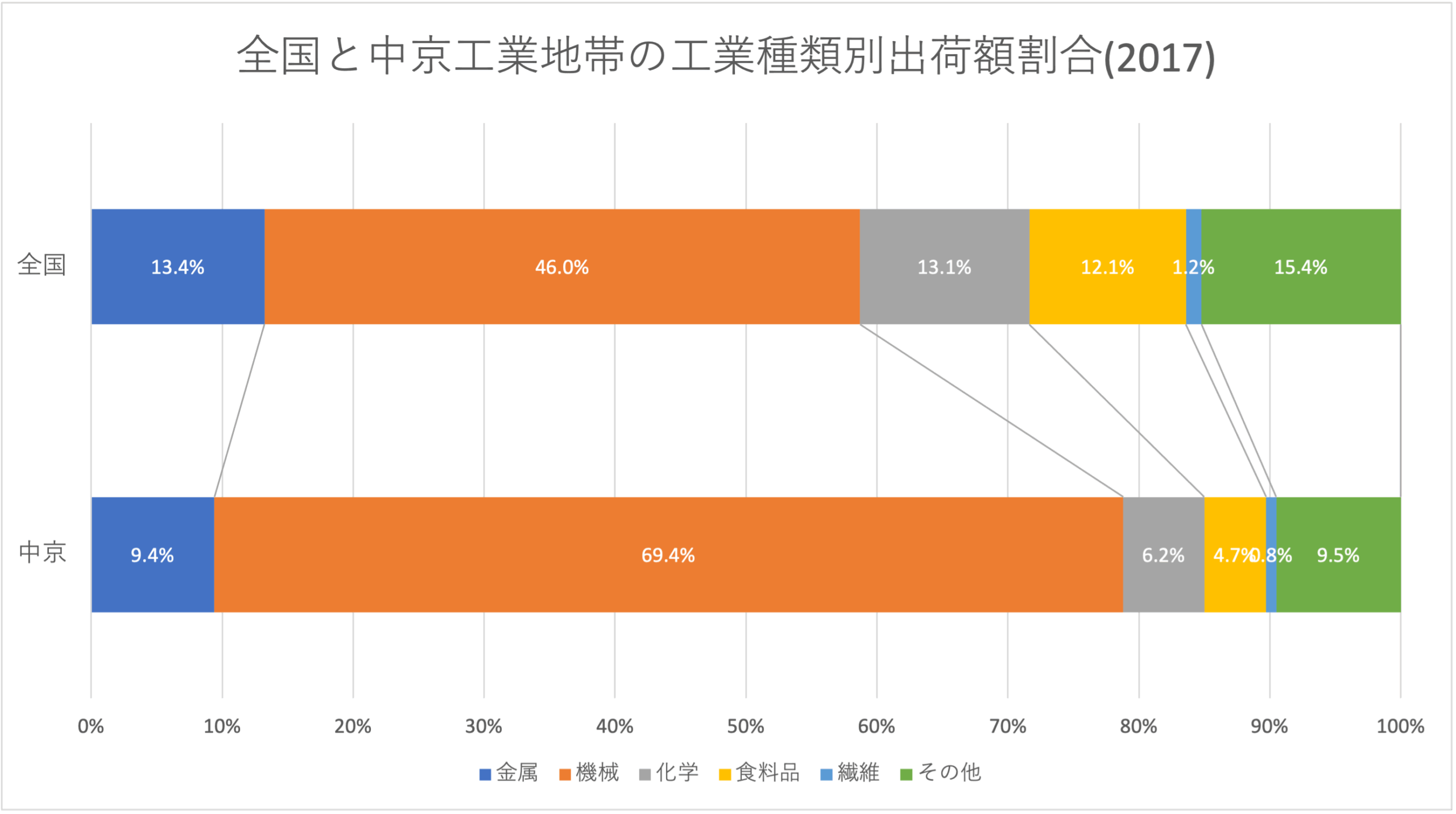 さてそれでは実際に使って解説していこうと思います。下のグラフは全国の出荷額割合と中京工業地域の出荷額割合とを比較するものです。色別,つまり産業別に比べていくことで中京工業地帯の工業の特徴を知ることができます。(データは教育出版株式会社とHelloSchool社会科からの引用です)。