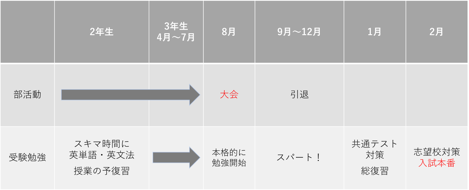 いずれの場合でも、重要なのは部活と勉強の時間をきっちり分けること、引退後にしっかりと気持ちを切り替えて勉強に集中することです。特に、引退後に頭を「受験モード」に切り替えることは欠かせません。メリハリを付けなければ中途半端な勉強になってしまい質・量ともに不足してしまうでしょう。