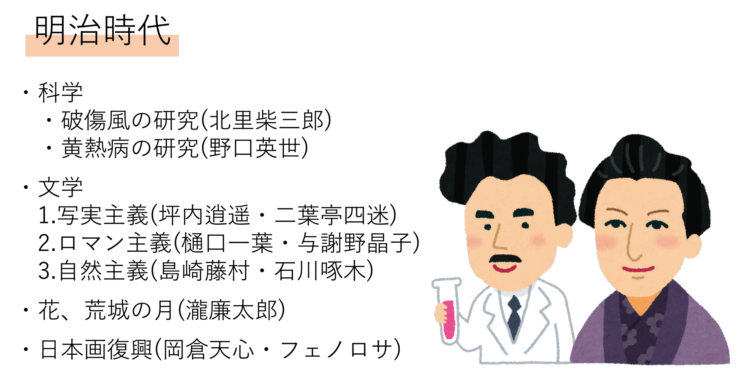 そして最後に見ていくのが芸術の成長です。芸術と言ってもその中身は多岐に渡りますが,特に音楽の世界における荒城の月・花などの作曲をおこなった瀧廉太郎や,美術の世界において日本画の復興に努めた岡倉天心とアメリカ人のフェノロサの2人組は頭に入れておきたいところです。