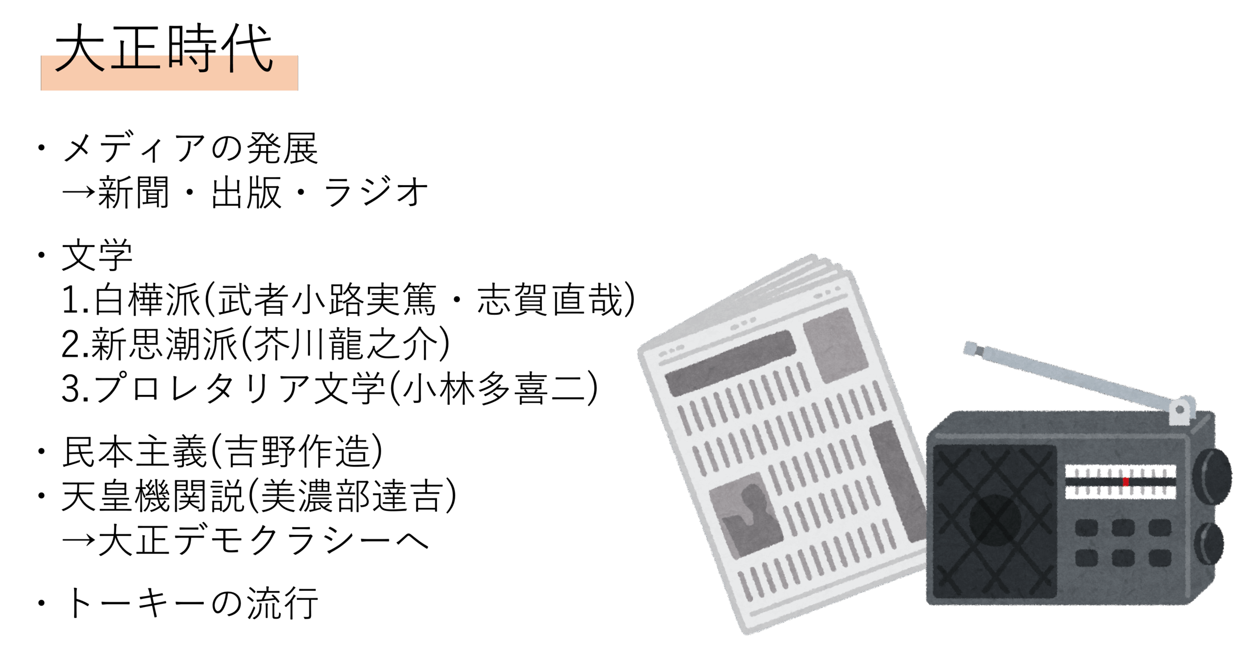 まずは注目しておきたいのはメディアの発展です。1つ目に見ていくのは新聞です。特に大阪朝日新聞・大阪毎日新聞・讀賣新聞の3紙が伸びていき,三大紙と呼ばれるようになりました。2つ目に見ていくのは出版です。中央公論などのような総合雑誌や,キングといった大衆雑誌が創刊され,講談社・小学館といった有名な出版社もこの時期に出来ました。3つ目に見ていくのはラジオです。1925年にラジオ放送が始まると,時代の動きが庶民に伝えられるようになるだけでなく,そこで流行りの歌が生まれたりもしました。