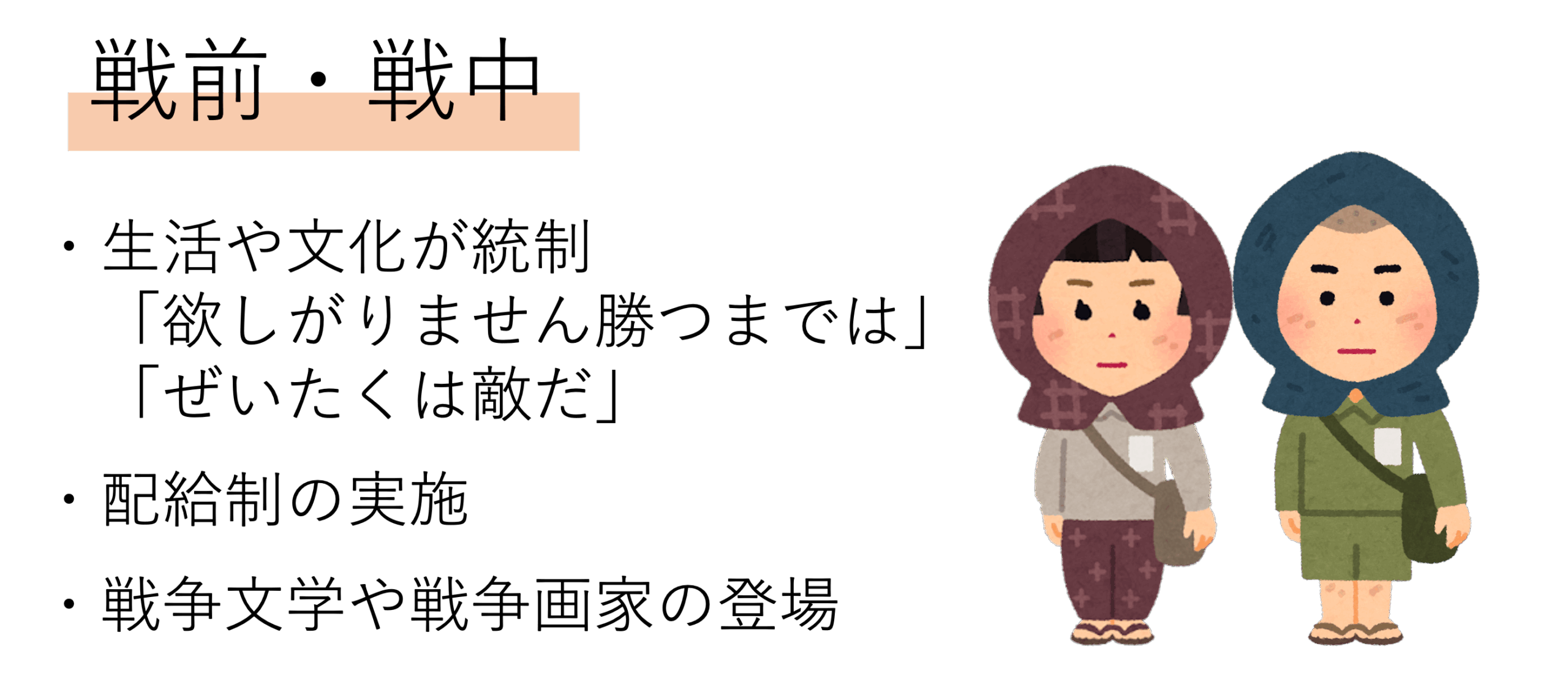 ここからは昭和時代のうち戦前・戦中の時期に注目して文化のあらましを抑えていきましょう。大前提として,日中戦争や太平洋戦争の最中にいるときの日本は戦争に全てのパワーを捧げているため,民衆から文化は取り上げられてしまいます。そのことを表すようなフレーズとしてほしがりません勝つまではというものやぜいたくは敵だというものが挙げられます。1941年には米不足への懸念から配給制が実施され,国民に国が食料や日用品を割りあてて配るようになり,生活はどんどん規制されていきます。