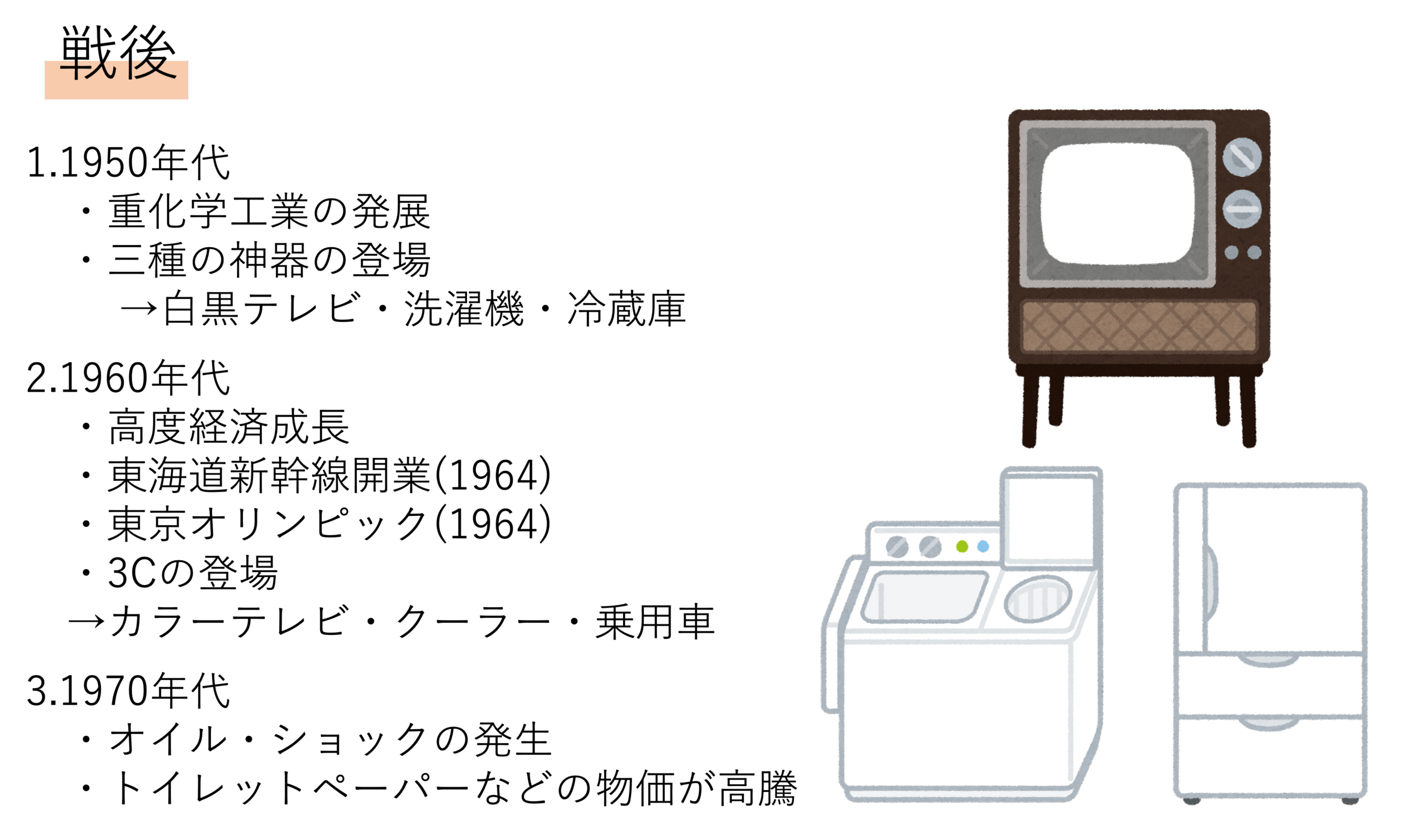 まず取り上げるのは1950年代中頃,高度経済成長が始まる復興期です。この時代は重化学工業が発展し,技術の革新や石炭から石油へのエネルギー源の移行が進められ,そんな中で高い成長率が続いて国民の収入も増えていきました。人々の生活においては,この1950年代後半という時期には三種の神器と呼ばれる豊かさや憧れの象徴が生まれました。その中身は白黒テレビ・洗濯機・冷蔵庫です。後々紹介する3Cと間違えやすいので,気をつけて覚えましょう。