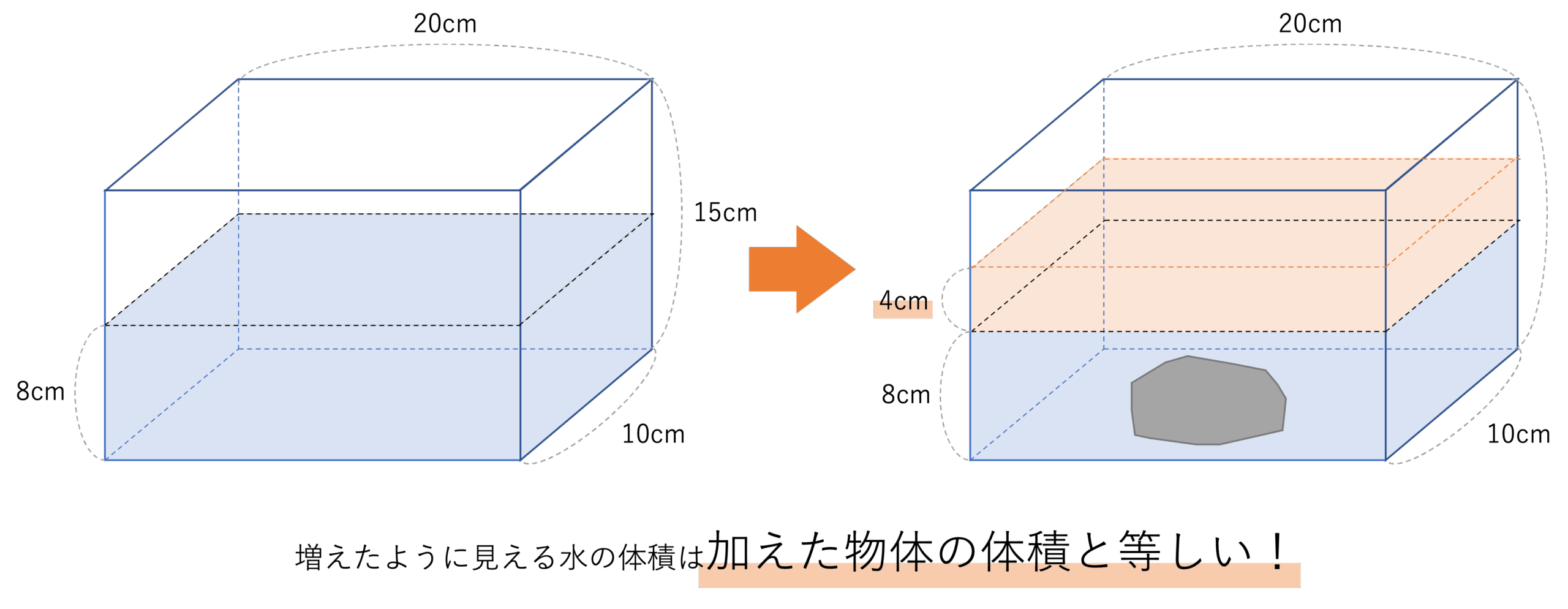 この問題を増えたように見える水の量=物体の体積という関係から読みといていきます。今回の問題では石を加えたところ水面が4cm上昇したという指示が与えられていましたが,この上昇分が石の体積と等しいと考えると,増えたように見える水の量が何cm3であるかを計算すれば答えが求められそうですね。