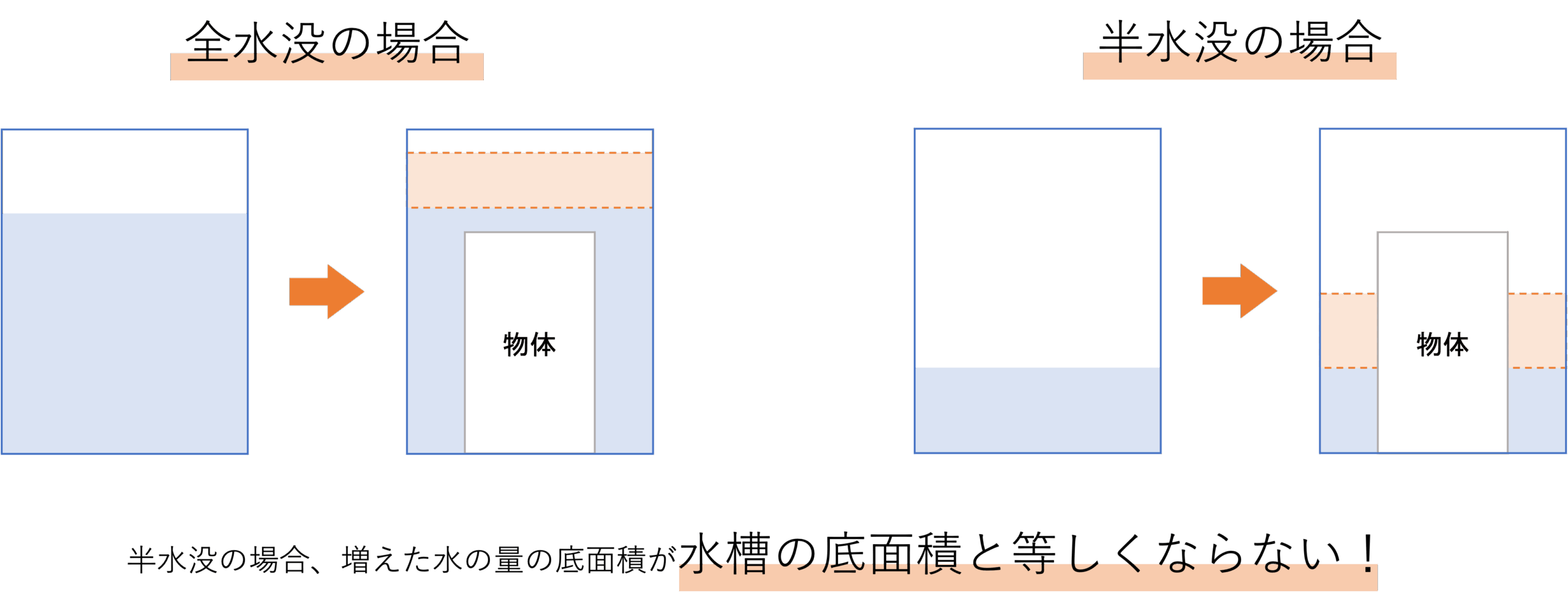 ここからは少しレベルの高いモノの水没問題の解説に移ります。先程の問題では増えた水の体積は加えた物体の堆積と等しい,という説明を行いました。しかし中学受験に登場する問題の中にはよりレベルの高いものがあります,それが半水没の問題です。先ほどの石を沈める問題では全体を沈めるという全水没の場合が想定されていましたが,それに対し物体の一部が沈んで一部は水に浸かっていない半水没の問題は簡単に増えた水の体積が計算できないため,解きにくい問題になってしまいます。というのも半水没の場合,増えた水の底面積が水槽の底面積と一緒にならないからです。違いを分かりやすく説明すると,次の図のようになります。