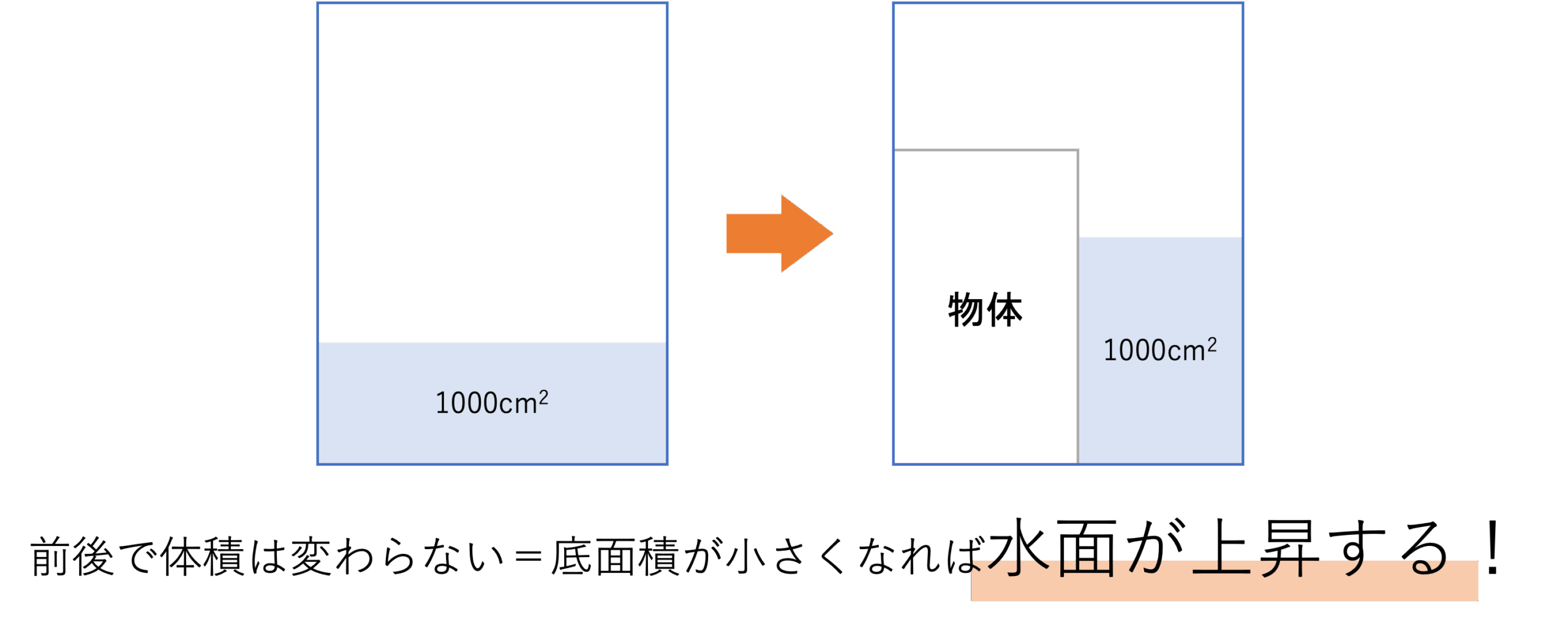 このように水槽に何かを沈める・入れるという操作が行われていたら,それは水没の問題だと判断して計算を進めてしまっていいでしょう。今回はこれらの問題を基にして,攻略法をご紹介していきます。