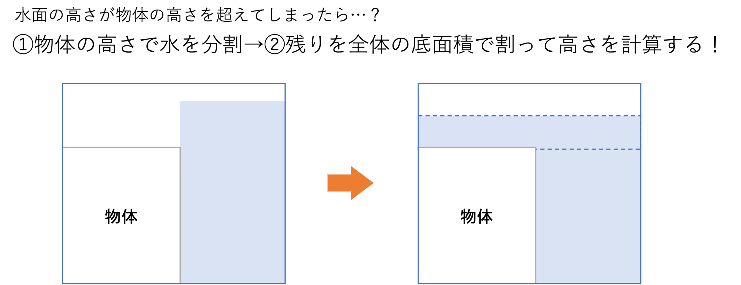 ただしここで注意しておきたいところが,まだこの時点では半水没か全水没かが確定していないということです。全水没と半水没の違いは,水面よりも物体の高さの方が高い位置かどうか,という状況の差にありました。そのため今解いている問題が全水没か半水没かを求めなければ計算に進むこともできません。したがって問題を解く前の段階でどちらに該当しているかを判断しなければならないのです。