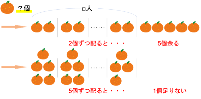 この問題では,みかんの個数・何個ずつ配るか・何個余る/足りないか・家族が□人という情報が登場しています。これらを整理すると下図のようになります。