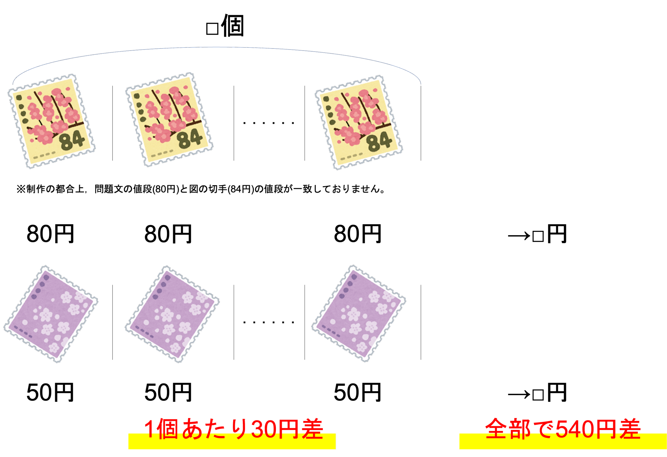 まずは情報の整理ですね。今回の問題からは50円・80円という2種類の切手を□枚ずつ買うと540円の差があった,という情報が読み取れます。これらを例題で提示した図のようにまとめていきましょう。このとき全体での値段の差・切手1枚あたりの値段の差,つまりは全体の差と1つあたりの差にも注目しておくと,以降の計算が楽になります。下のような図が作れていたら完璧です。