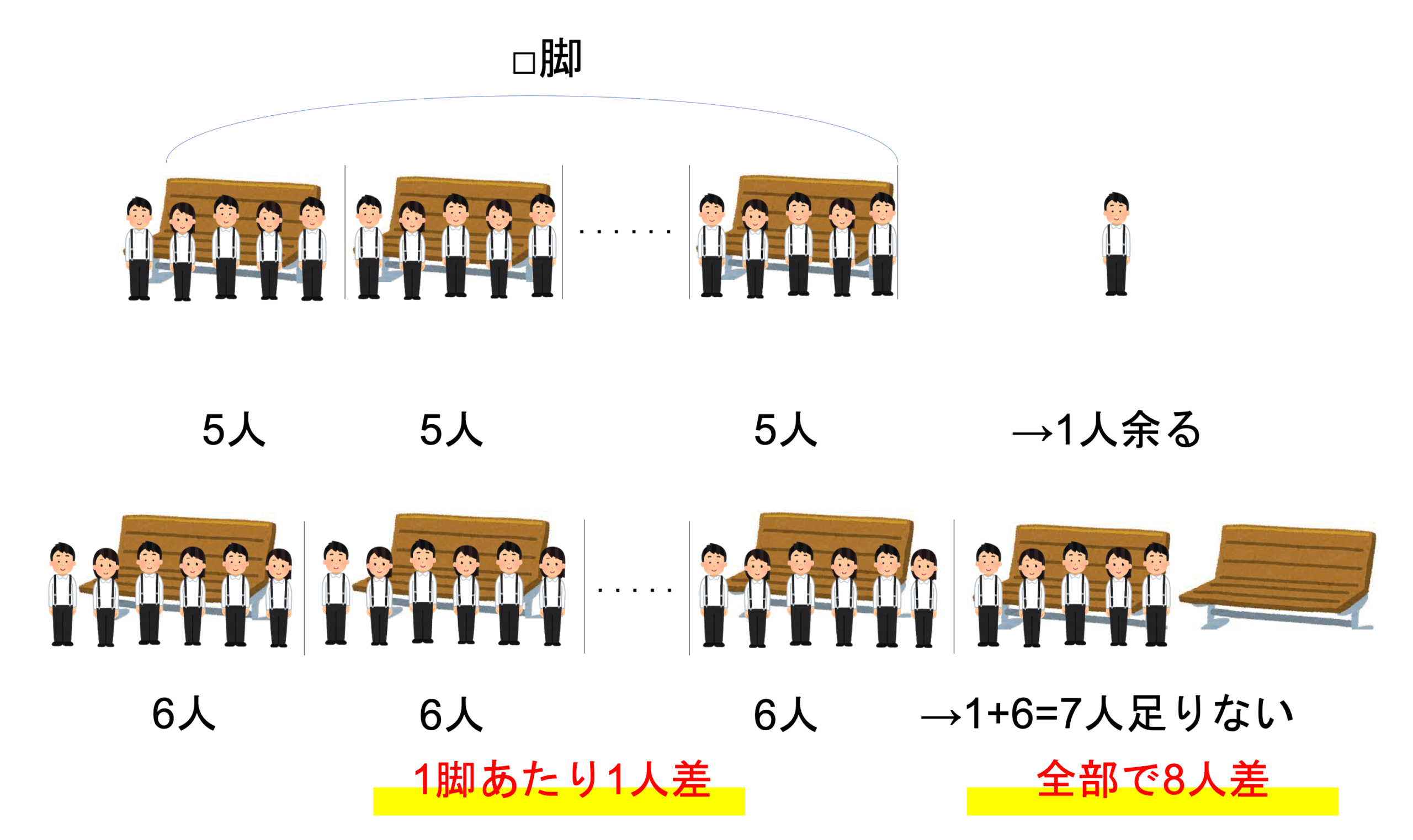 他方全体の差はどのようになっていたでしょうか。5人が座るパターンでは1人余ってしまい,6人が座るパターンだと2人分+1脚,つまりは7人足りないという指示が出ていました。このことから全体の差は8人だとわかります。