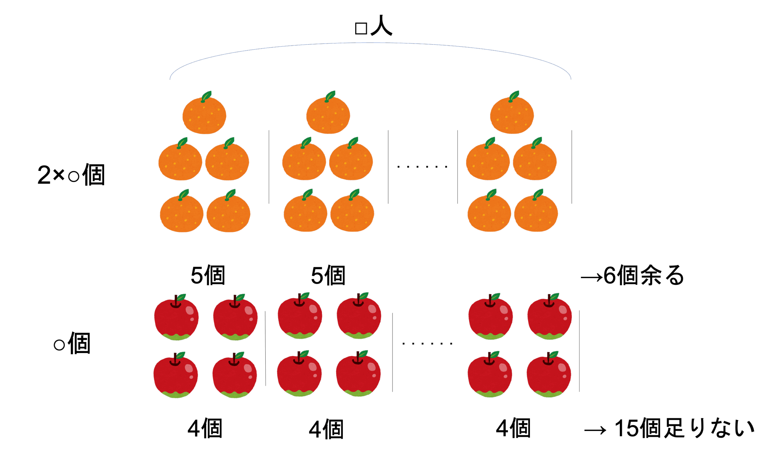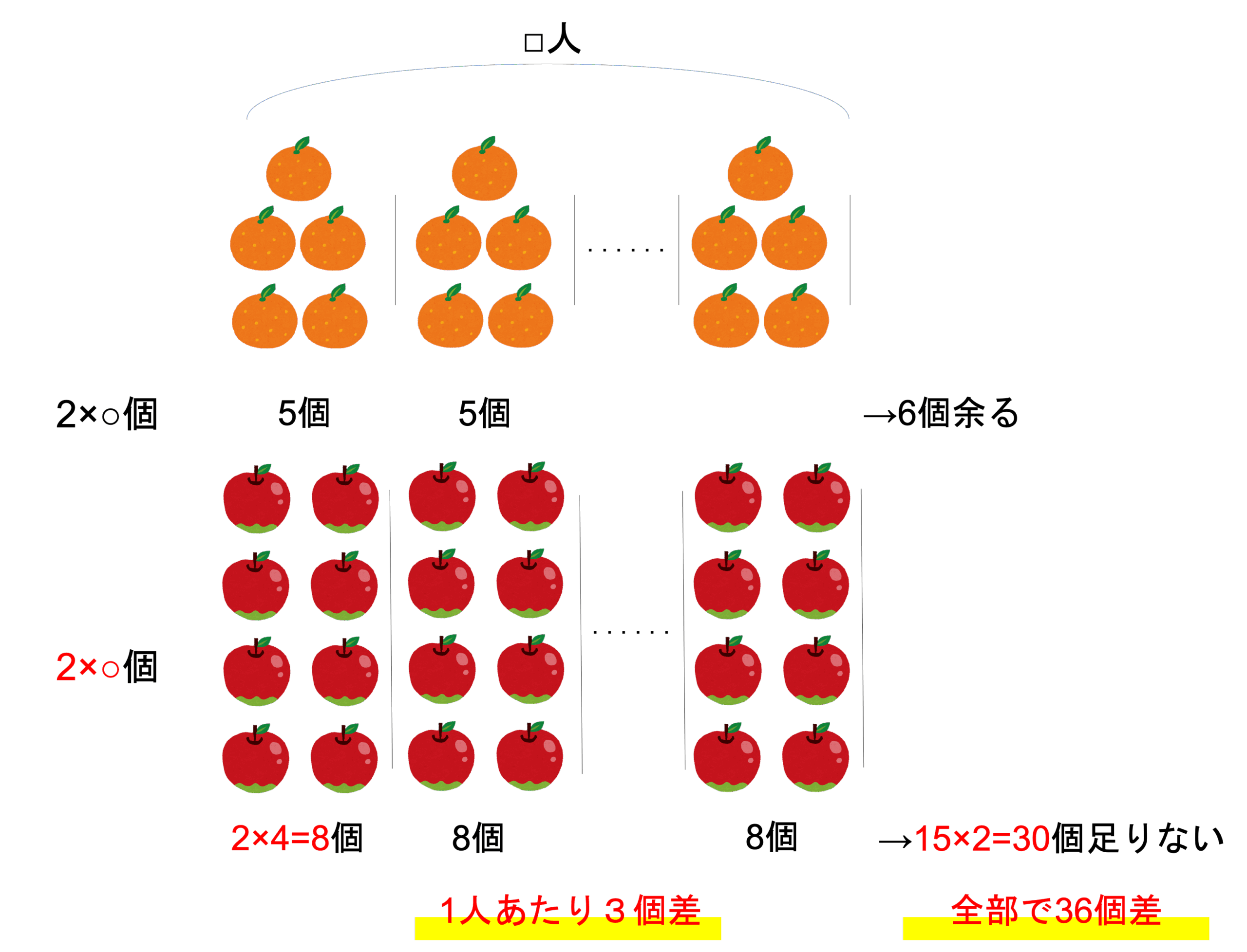 この図から一見1人あたり1個差・全体で21個差だと計算を進めたくなります。しかし1人あたり/全体という視点から全体の個数を求めることができるのは,全体の個数が揃っている場合だけです。みかんとりんごという2つのものを分けてはいますが,それらの全体の数が揃っていないので,計算することはできません。