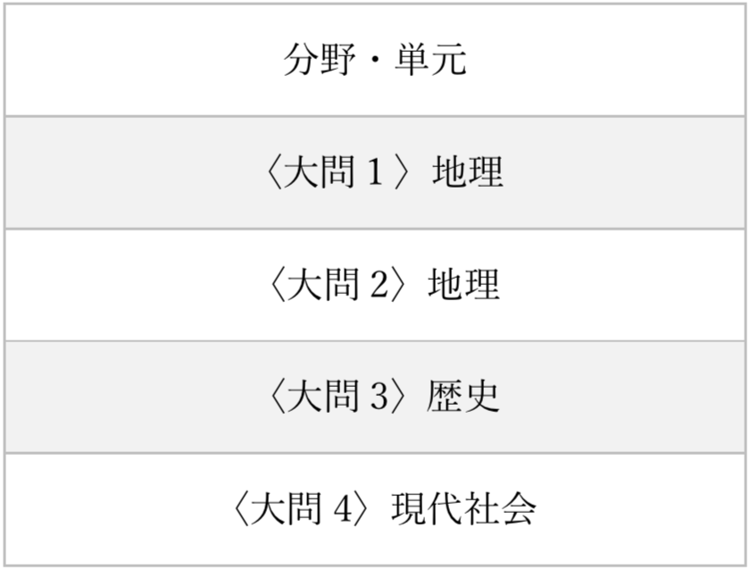 基本的には地理の問題が2問、歴史・現代社会(公民・時事含む)の2分野からそれぞれ1問ずつ出題されることがほとんどです。複数分野を組み合わせた融合問題のようなものは出題されていません。