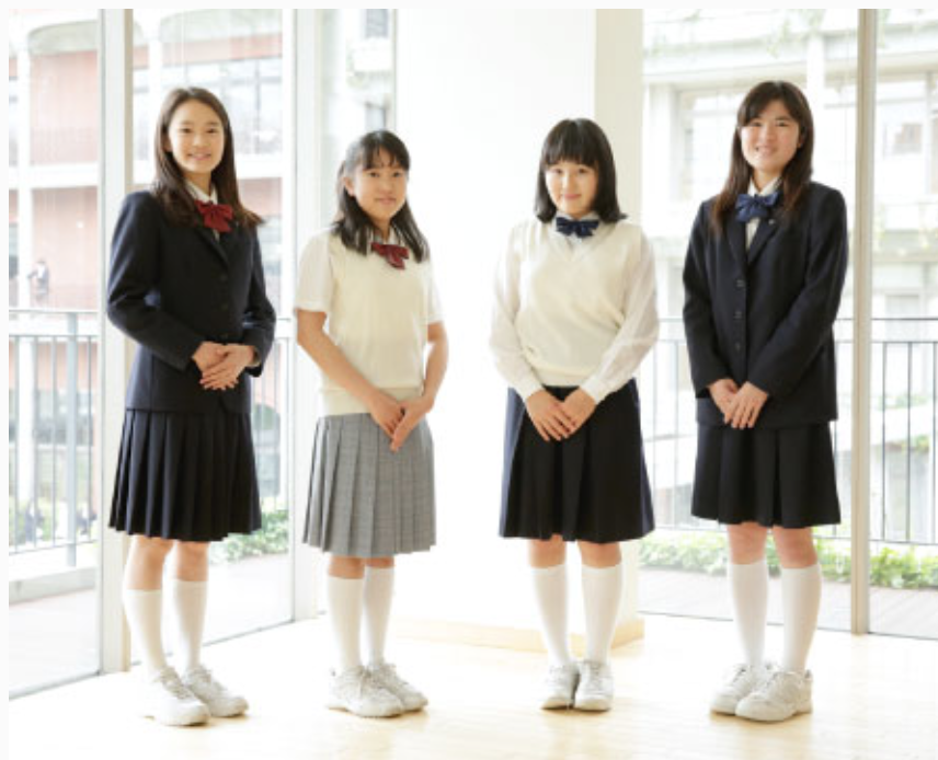 校服のジャケットは、濃紺ウール100%生地を使用し、着心地よく動きやすいように立体裁断をしています。スカートは、中学生は20本のプリーツ、高校生はボックスプリーツです。ブラウスは白角襟で、中学生はえんじ色、高校生は紺色のリボンです。ベストは紺または白。夏にはライトグレーのプリーツスカートを着用することもできます。