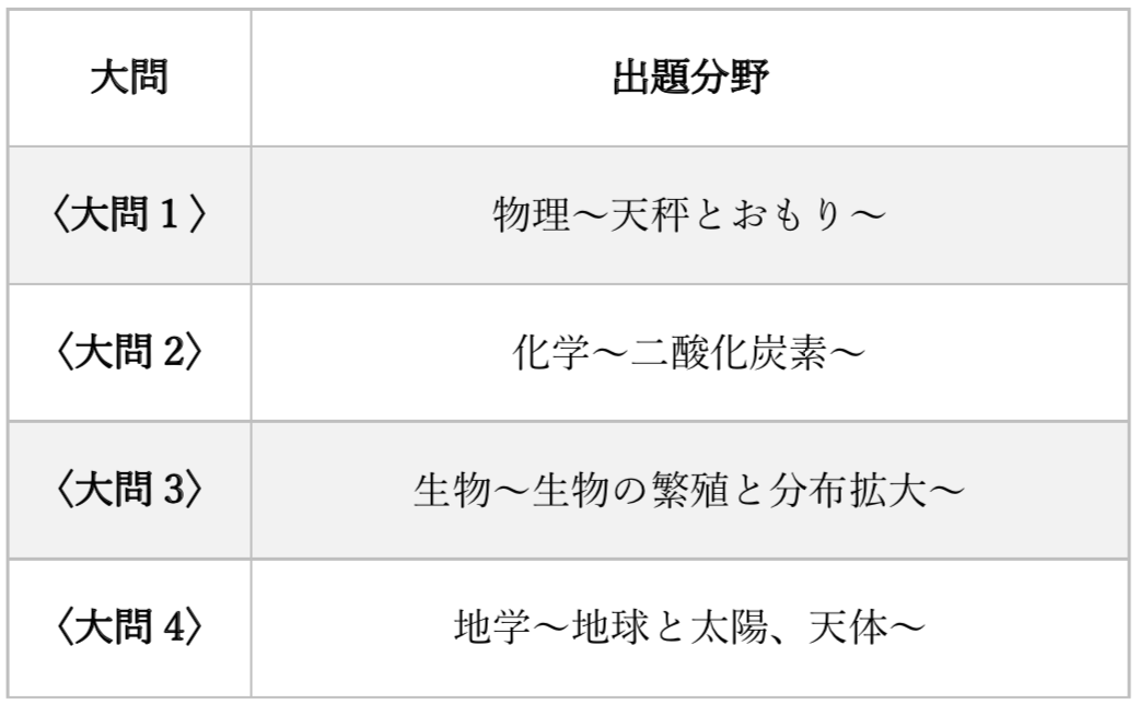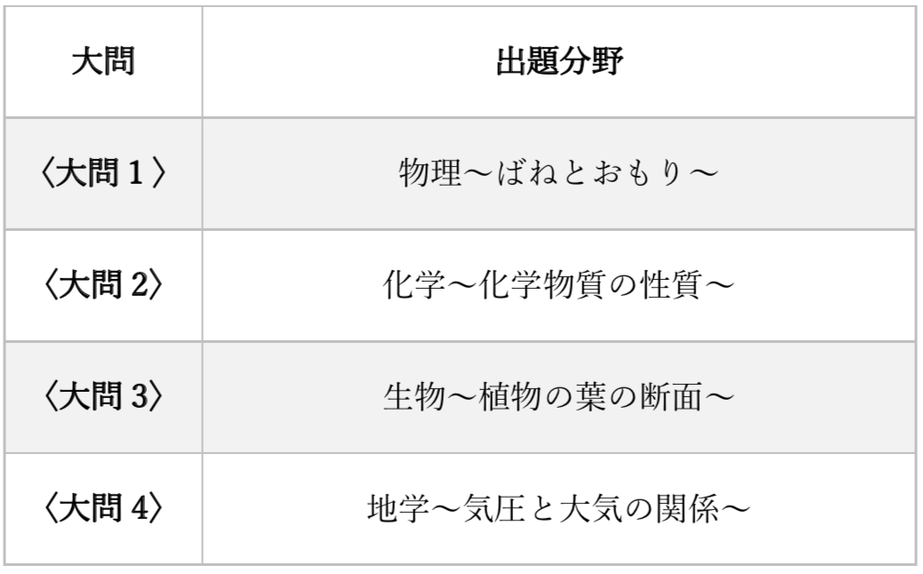 基本的には物理・化学・生物・地学の4分野からそれぞれ1問ずつ出題されており、一つの分野から複数題出題されることはほとんどありません。