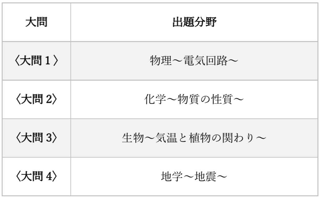 基本的には物理・化学・生物・地学の4分野からそれぞれ1問ずつ出題されており、同じ分野から複数題出題されるという場合はほとんどありません。