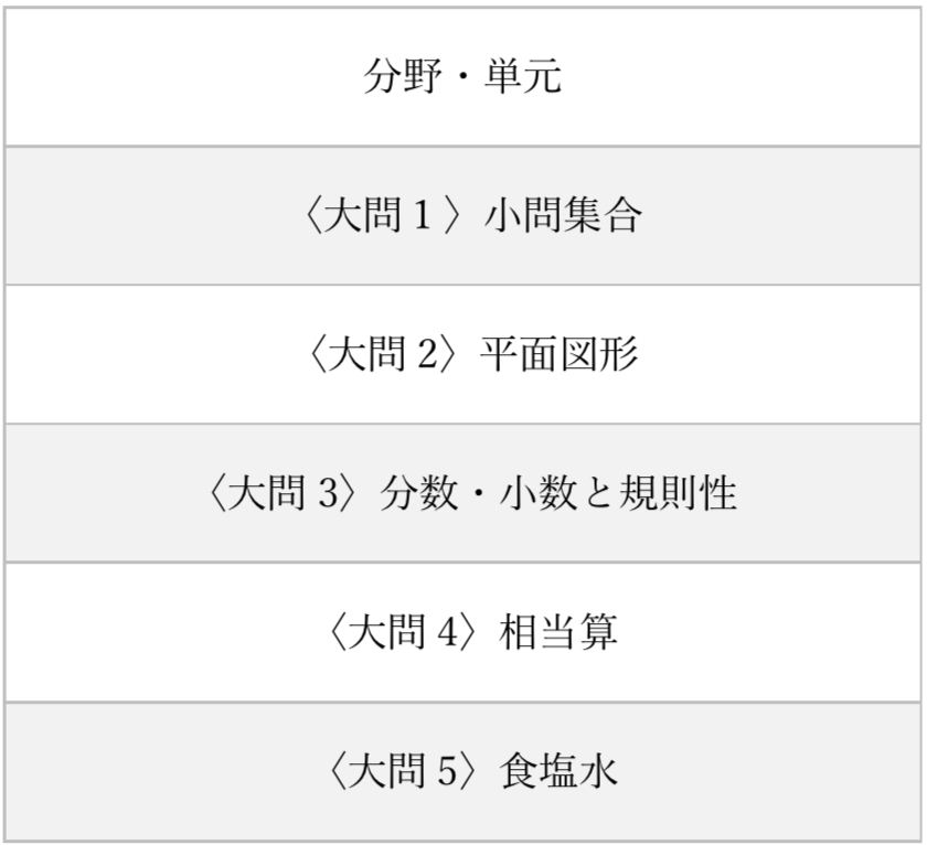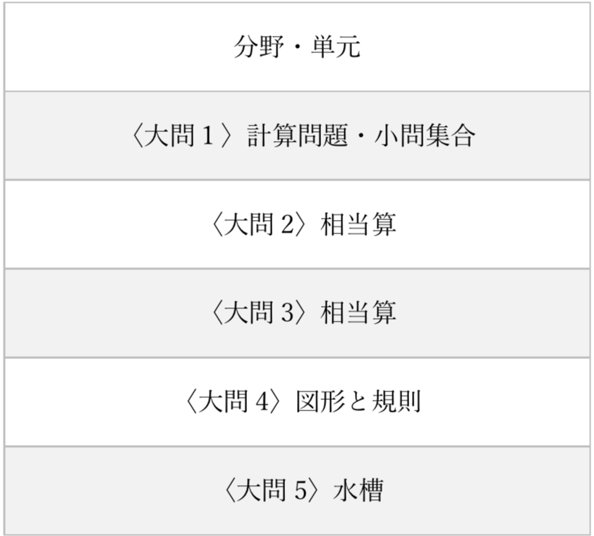 大問5〜6問のうち、第1問は基本的な四則混合の計算問題と小問集合の問題、第2問〜第6問は応用問題という問題構成です。